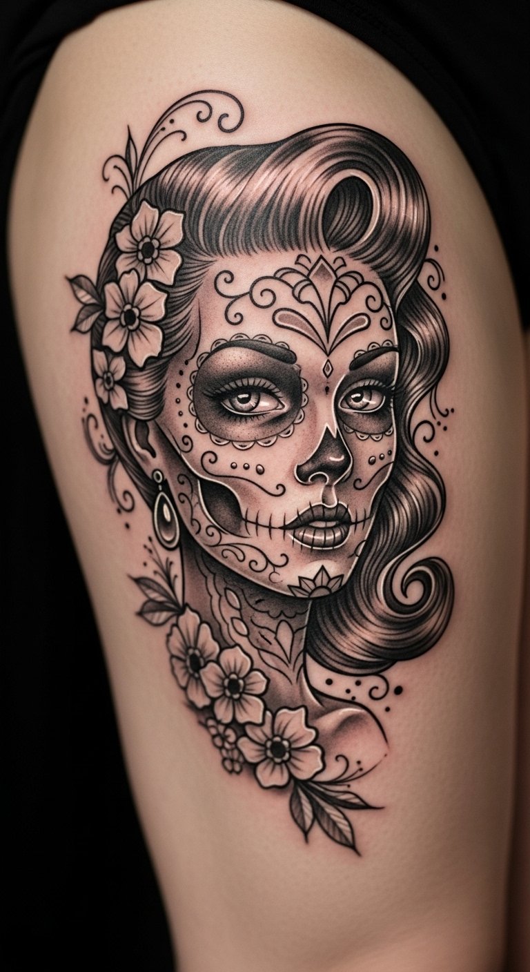 Mix retro vibes with skull art. Add curves and flair for a unique spin. Place it on your thigh for style. Sketch with old magazines as inspiration. DIY with basic drawing paper. Include hearts for personality. This combines fun and meaning. Practice on fabric first. Stay budget-friendly and creative.