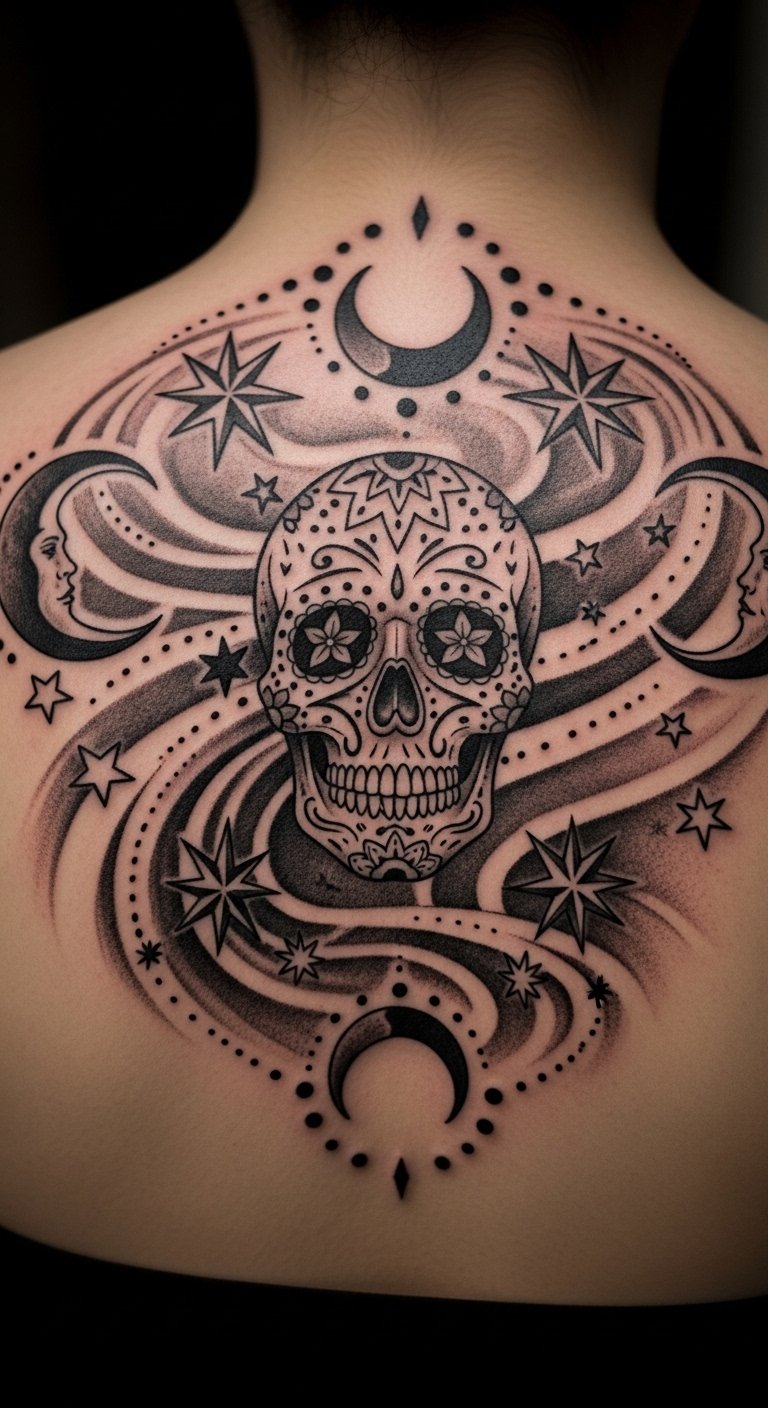 Incorporate stars and moons for wonder. They orbit the skull nicely. Try your back for a big canvas. Sketch constellations at night. Free apps aid design. Add phases of the moon. This sparks imagination. Do it affordably with paper.