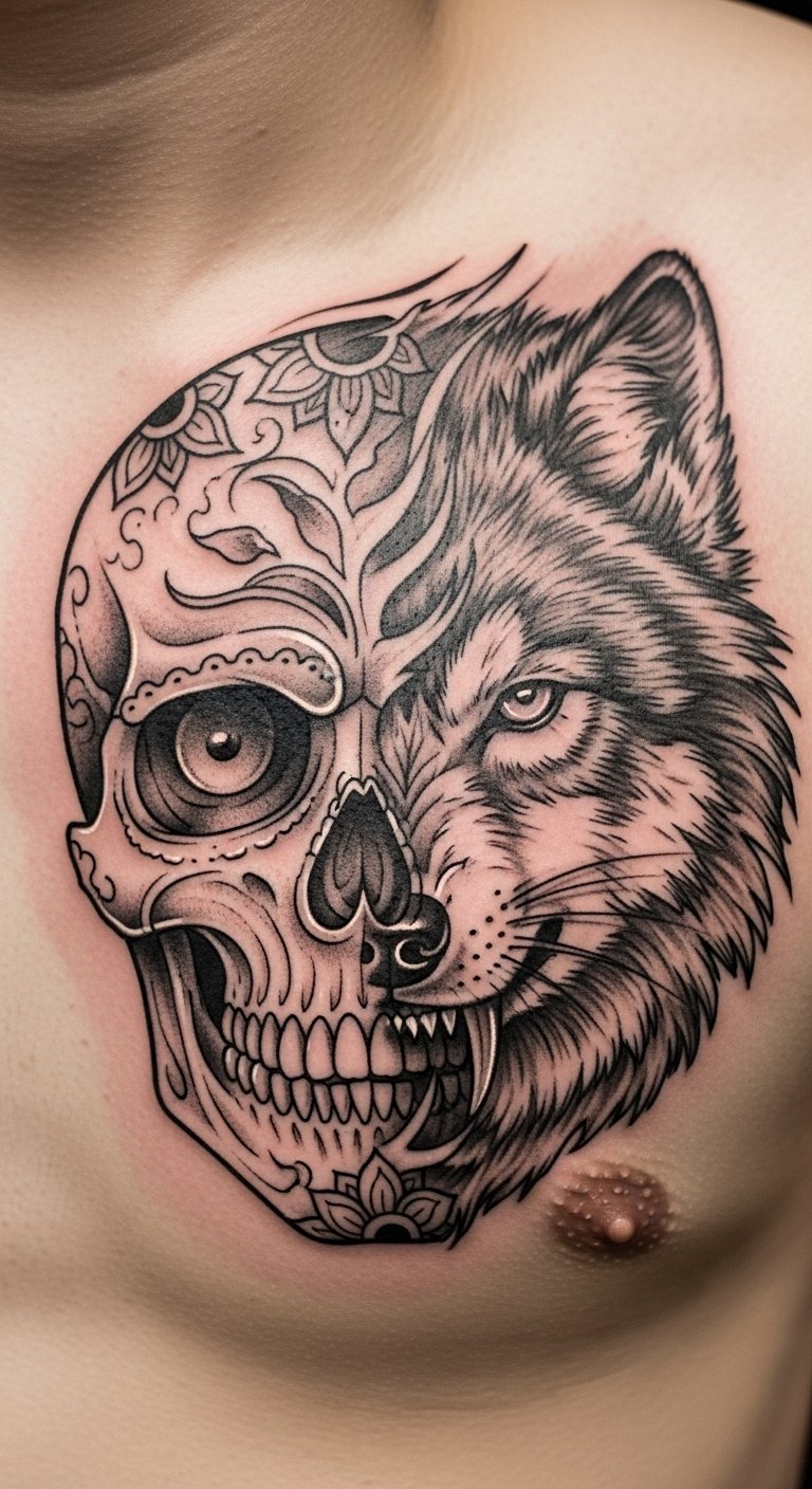 Pair the skull with animals like wolves. It creates a fierce story. Place on your chest for impact. Draw animals from photos. Use simple tools at home. Include eyes for intensity. This mix is powerful. Keep costs low with sketches.