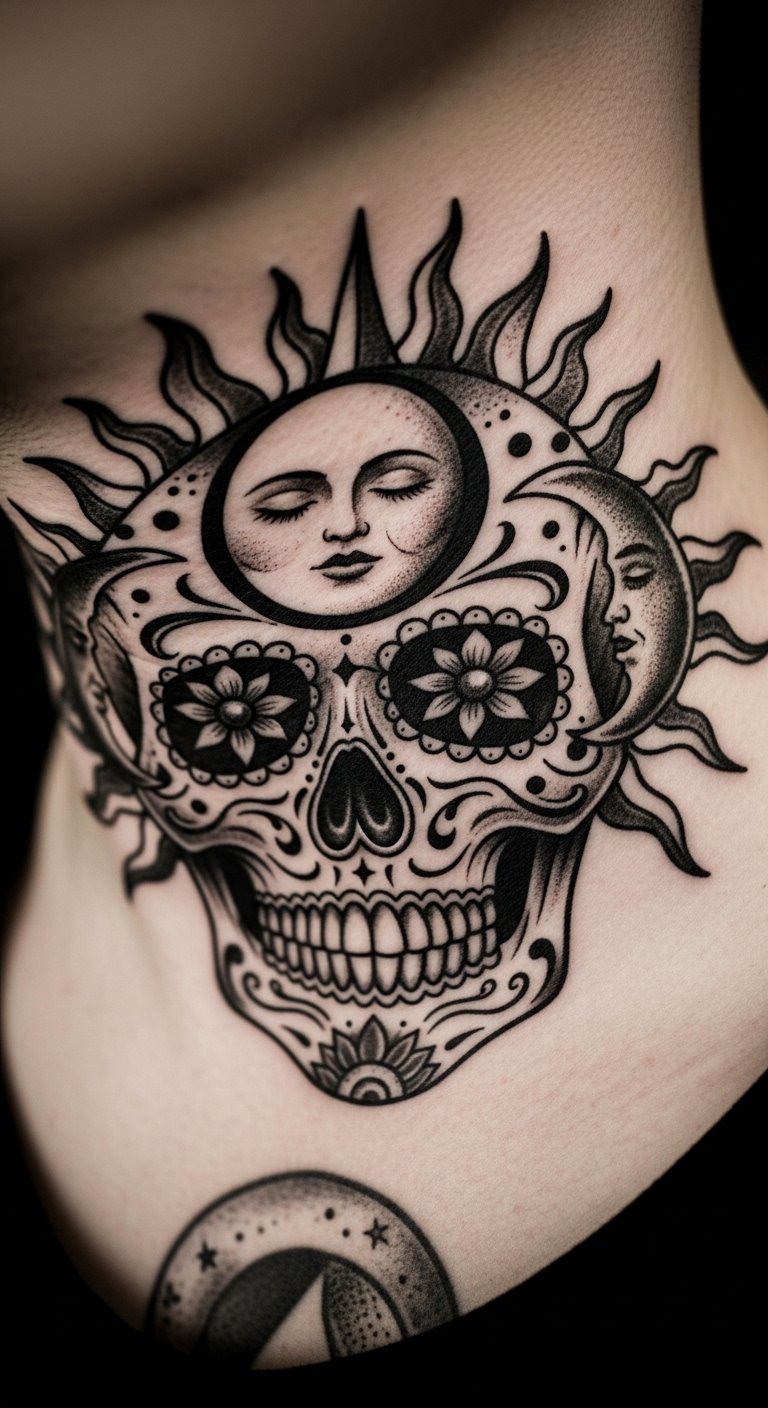 Add sun and moon for balance. They frame the skull well. Neck spots add mystery. Sketch symbols quickly. Free designs help. Include rays for light. This mix inspires. Try it affordably.