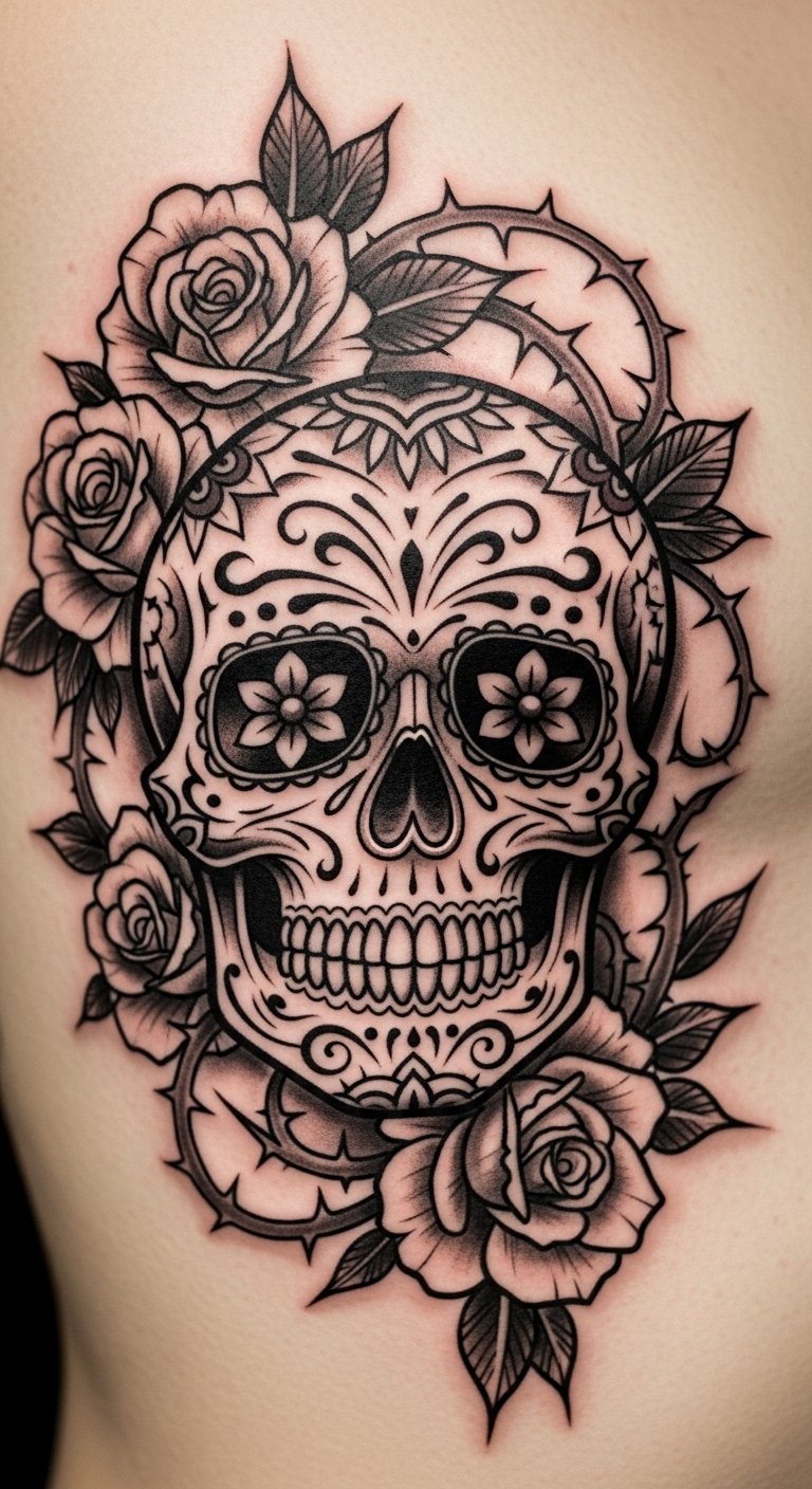Decorate with roses and thorns. They edge the skull nicely. Ribs offer a hidden spot. Draw roses from gardens. Use paper for stencils. Add stems for growth. This enhances beauty. Keep it simple.