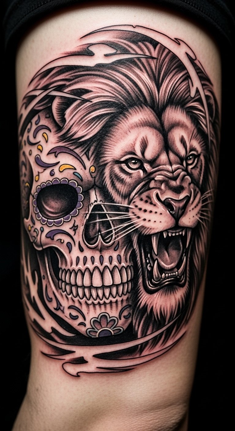 Pair with a lion for protection. It guards the skull strong. Biceps show power. Draw lions from videos. Online templates aid. Add manes for wildness. This design empowers. Do it with basic tools.