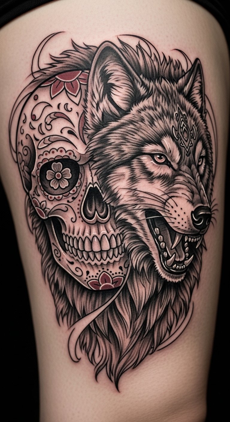 Blend in a wolf for spirit. It howls beside the skull. Thighs allow for detail. Sketch wolves simply. Free resources inspire. Include eyes for soul. This adds depth. Experiment easily.