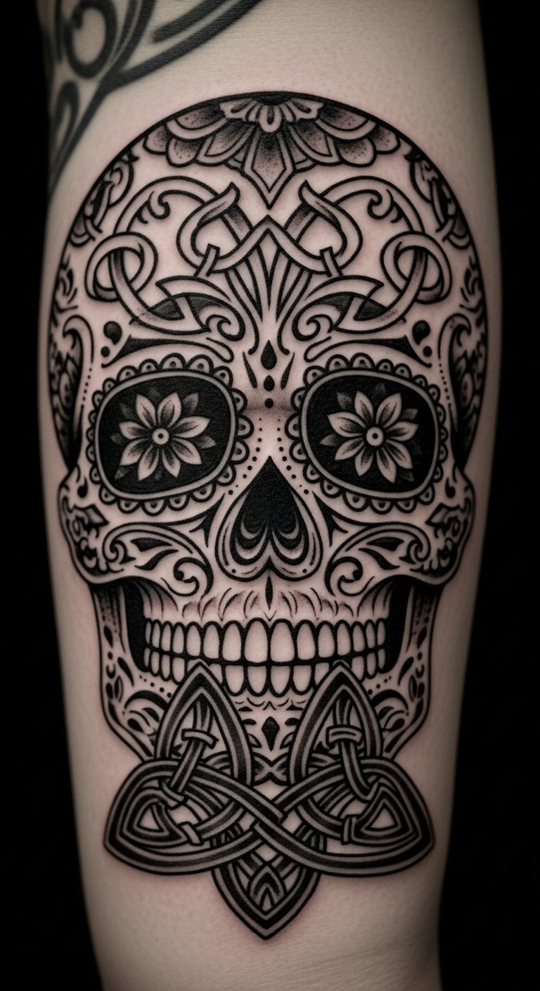 Weave in Celtic knots for eternity. They circle the skull. Arms display them well. Trace knots on paper. Online ideas flow. Add loops for continuity. This connects cultures. Try it affordably.