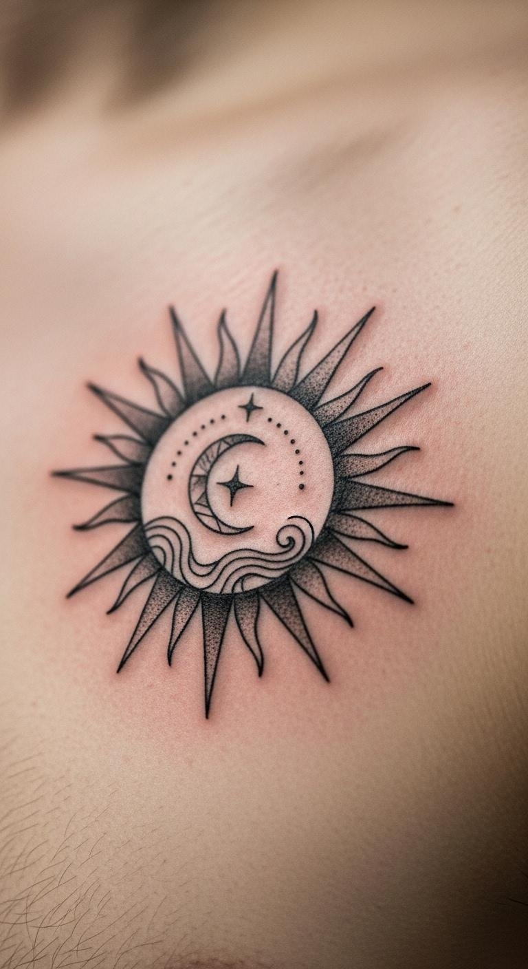 Surround your sun with stars for a cosmic feel. This setup means vast possibilities and light. See twinkling dots framing the sun. It brings positive vibes from the universe. Use star stickers from a dollar store to plan your layout. Fun and cheap. Sketch on paper with a pen for practice. Easy idea. Tattoo on your back for a grand scale. Dots keep it budget-friendly. Stars enhance the wonder.