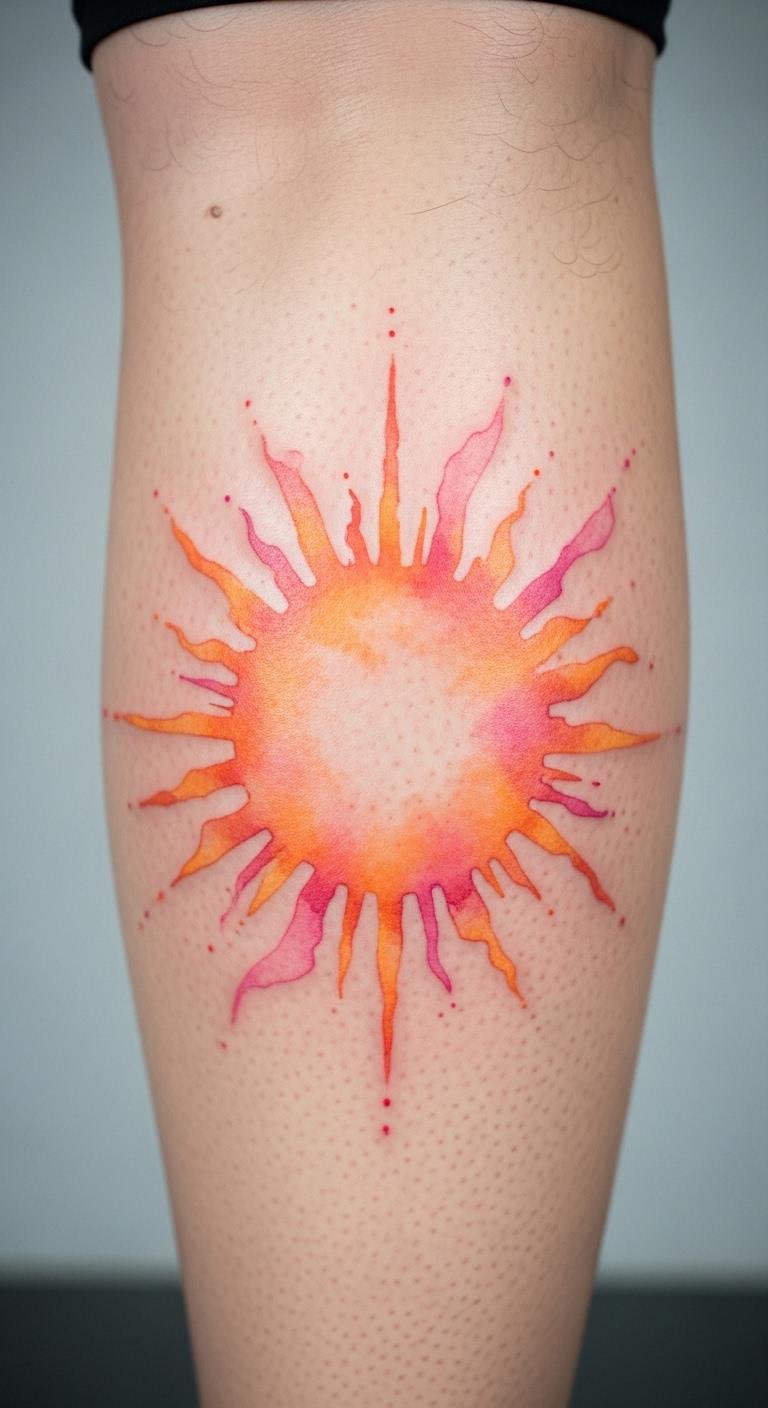 Go for a watercolor style to make your sun feel like a painting. Soft blends of color show creativity and warmth. Envision light pinks and oranges fading into each other. It radiates energy in a gentle, uplifting way. Check thrift stores for art supplies to practice blending on paper. This keeps prep costs low. Try watercolor paints at home for a DIY mock-up. It washes away easily. Place it on your leg for a fun, visible spot. Use fewer colors to save on tattoo fees. Bright hues pop without overcomplicating things.