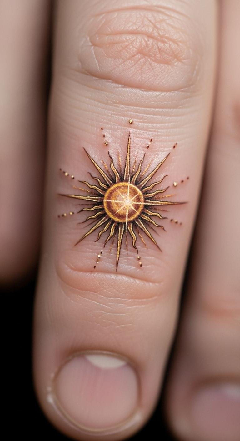 Keep it tiny and detailed for a subtle sun that packs punch. This realism style means precision and quiet power. Think of small rays with lifelike shades. It brings positive energy in a discreet form. Search free online tutorials to draw micro designs yourself. This cuts down on early costs. Use a fine-tip pen for home sketches. It’s an easy start. Tattoo it on your finger for a constant, personal boost. Go with basic black for affordability. Small size means quicker sessions and less money spent.