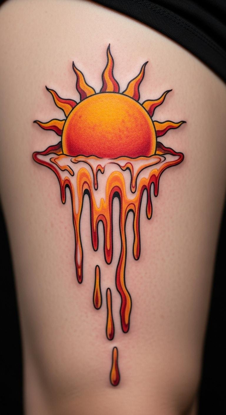 Think of a sun that’s not just shining—it’s melting into something new. This design shows change and growth in a fun way. Picture bold yellows and oranges dripping down like warm wax. It adds a positive twist to life’s ups and downs. For a budget option, sketch your own version on paper with markers first. This helps you tweak ideas before hitting a studio. Find an affordable artist online by checking local shops. They often offer deals for first-timers. Try drawing simple drips on your arm with henna as a DIY test. It washes off and lets you see how it feels. Bold colors stand out, so pick shades that match your vibe. Keep it simple to save on ink costs.