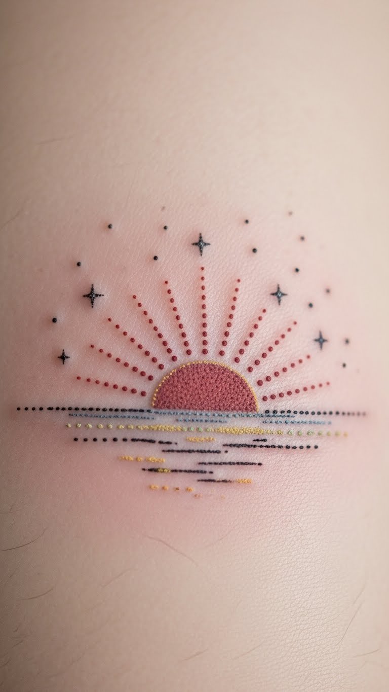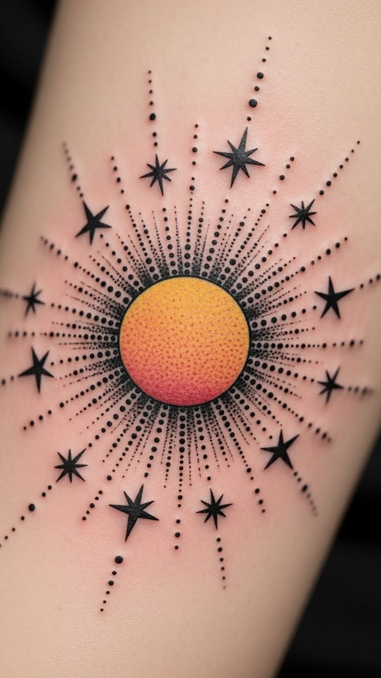 Dots and stars in sunset sky create a starry night blend. Imagine dots forming constellations around the sun. This detail works on the collarbone for a subtle glow. Dot patterns on paper with pens for home prep. Pick star stickers from stores for trials. Go dot-heavy to save on complex ink. Brief sessions keep it easy on the pocket. Build stars with a dot pen for DIY ideas. The spot shines in low-cut tops. Oil from your shelf maintains the dots. Light up your sky with simple stars.