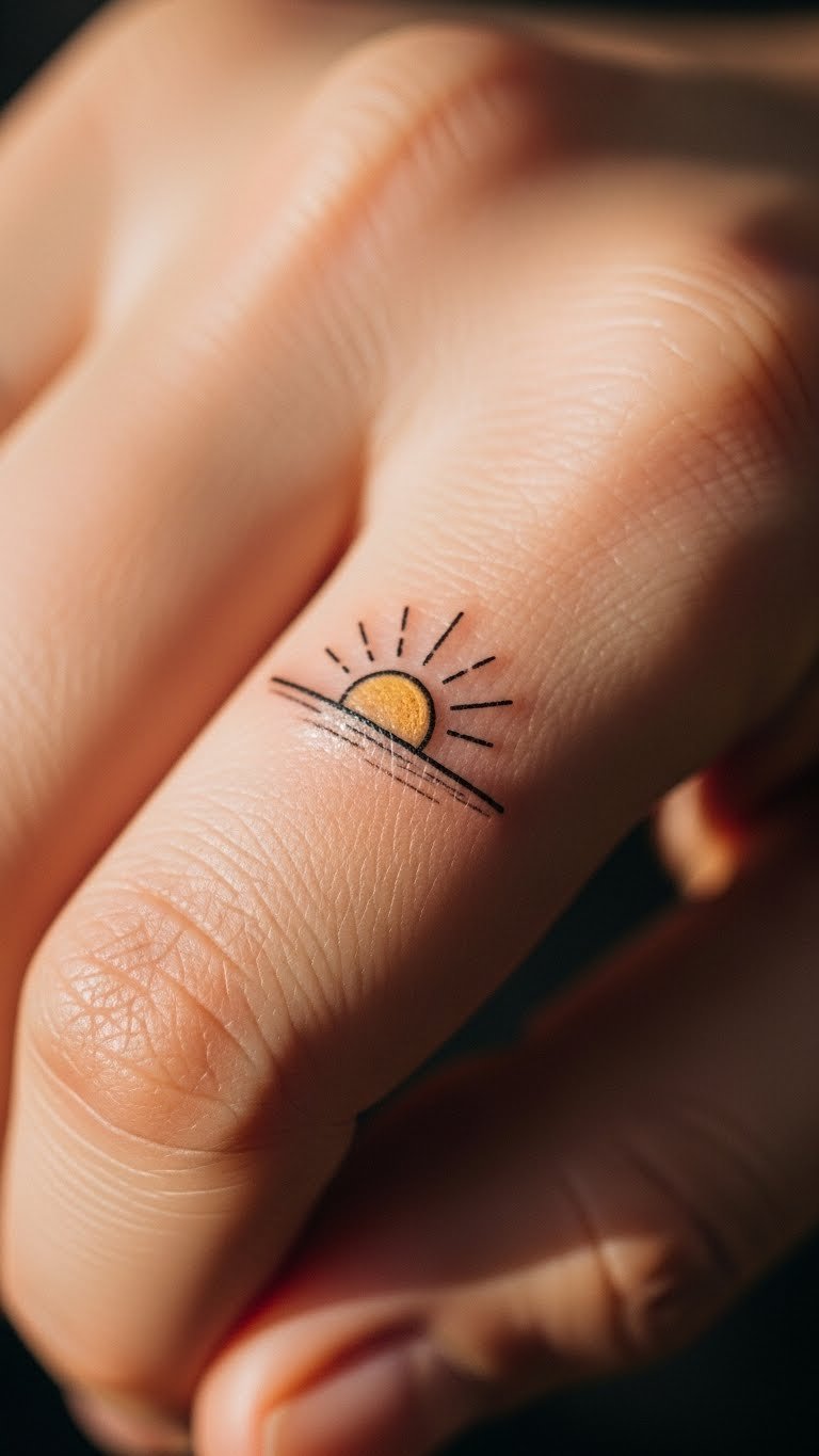 A small finger sunset tribute fits quiet moments. See a tiny sun on your ring finger as a daily nod. This size means quick, low-pain work. Jot ideas on your hand with pens for free trials. Grab temporary stickers from budget stores to preview. Go for single colors to cut expenses. Visits last minutes, saving time and cash. Add details with a fine pen for home fun. The spot peeks out in rings or gloves. Basic hand cream keeps it intact. Turn your finger into a pocket sunset, easily.