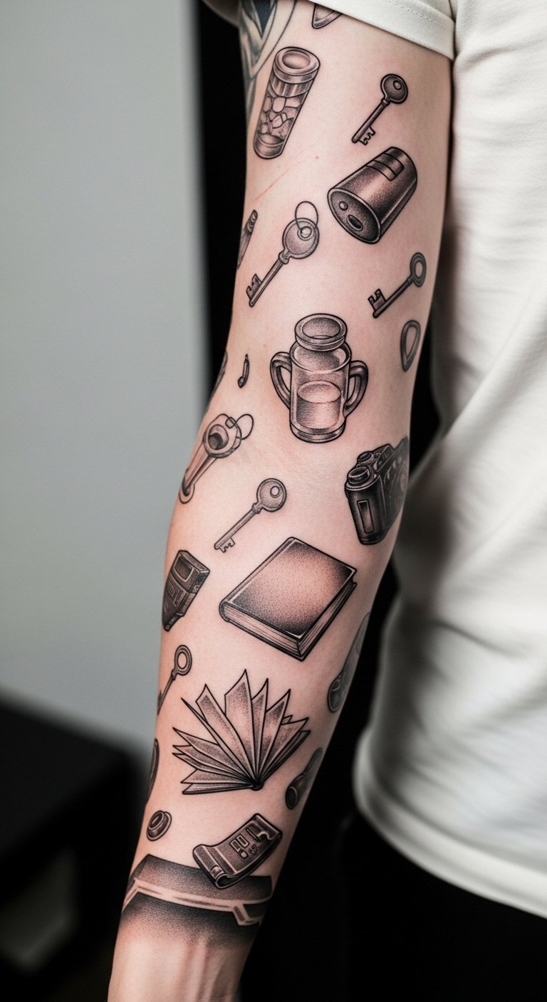 Imagine objects drifting on your arm like in a dream. A floating sleeve turns chaos into art. Grab colored pencils and sketch floating items at home. It costs nothing to start. Look for budget templates online for free. Bold this: start small with sketches. Divide your time: Draw one object, then link them. Use washable markers on your skin for a quick test—under $2 at any store. Find artists who offer deals for first-timers, around $150 for a basic piece. Add personal touches, like your favorite key, to make it yours.
