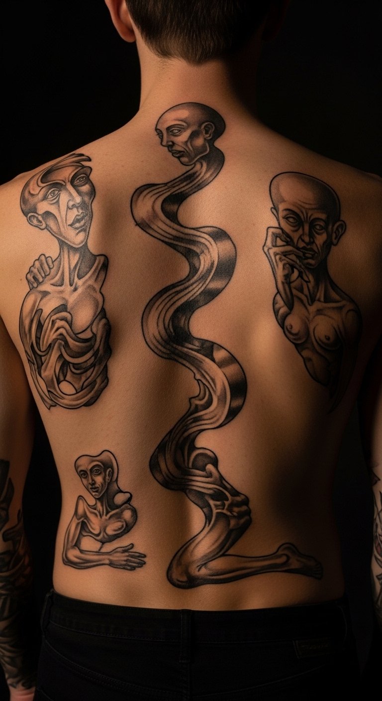 Twisted bodies on your back create wild stories. Distorted figures mix fun with depth. Draw simple shapes on paper to plan. Free drawing tools online help a lot. Bold the tip: use basic tools first. Split the process: Sketch one figure, then distort it. Try stick-on tattoos for $10 to see how it fits. Local shops often have sales, so aim for $200 total. Make it personal by adding a face you know. This keeps things affordable and easy.