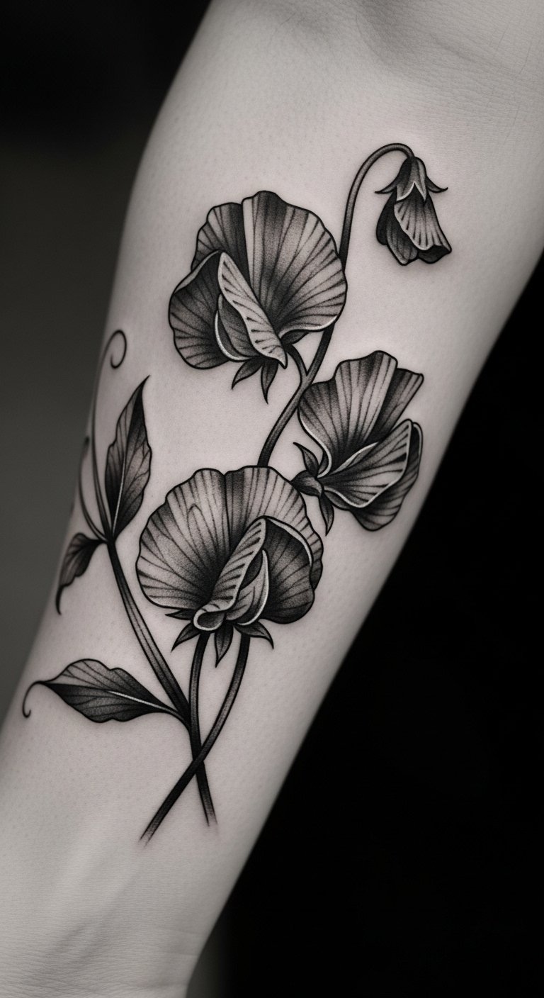 Black and gray sweet pea tattoos build strength. Choose this for a classic look. Sketch it in pencil first. Free templates online guide you. Place it where it matters. Such as your leg for private motivation. It represents steady growth. Practice with charcoal drawings. Do it at home easily. Keep it budget-friendly. Search for artists with low rates. A simple one won’t break the bank. Add details like veins for meaning. These tattoos foster resilience. Make yours unique. Try shading techniques with pens. See real progress in ink.