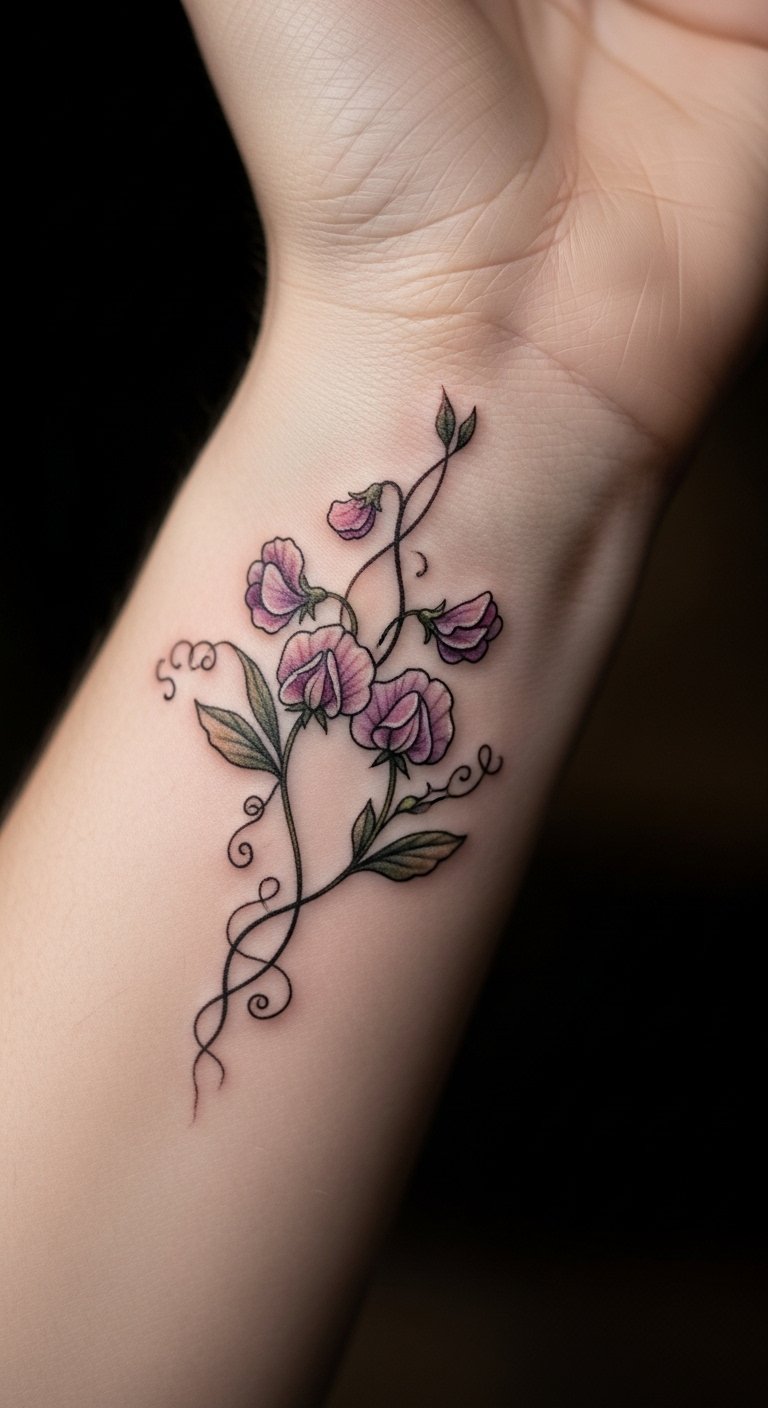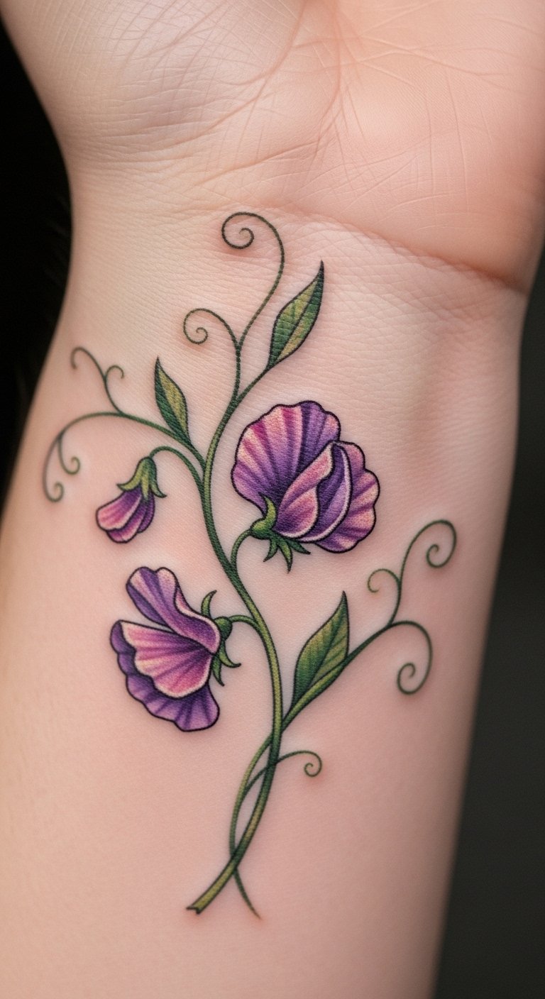 Wrist sweet pea tattoos keep reminders close. Opt for a small size. Draw it on your arm first. Use free drawing software. This spot shows growth daily. Like during routines. Experiment with placements. Trace outlines with markers at home. Save on costs this way. A wrist tattoo is often cheap. Personalize with added elements. Such as a bud for beginnings. These designs inspire action. Get one that fits your path. Look for walk-in spots. Make it a quick choice.