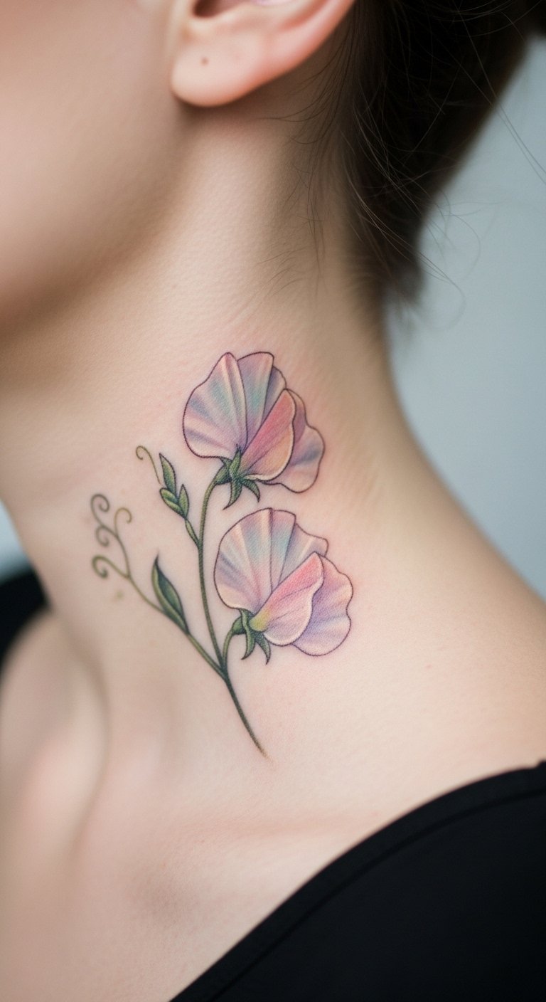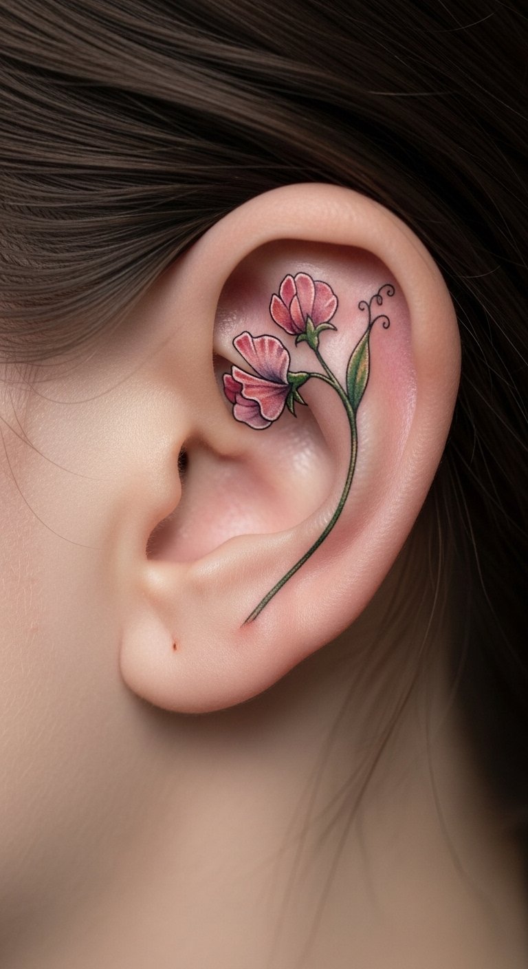 Behind-the-ear sweet pea tattoos offer subtle vibes. Go for something discreet. Sketch ideas on paper. Free apps make it fun. This placement nudges quiet growth. Wear your hair up to see it. Try temporary tattoos first. Use stickers from stores. They cost pennies. Add a twist like a leaf. These tattoos encourage inner change. Find a local deal. A small one is affordable. Make it personal quickly.