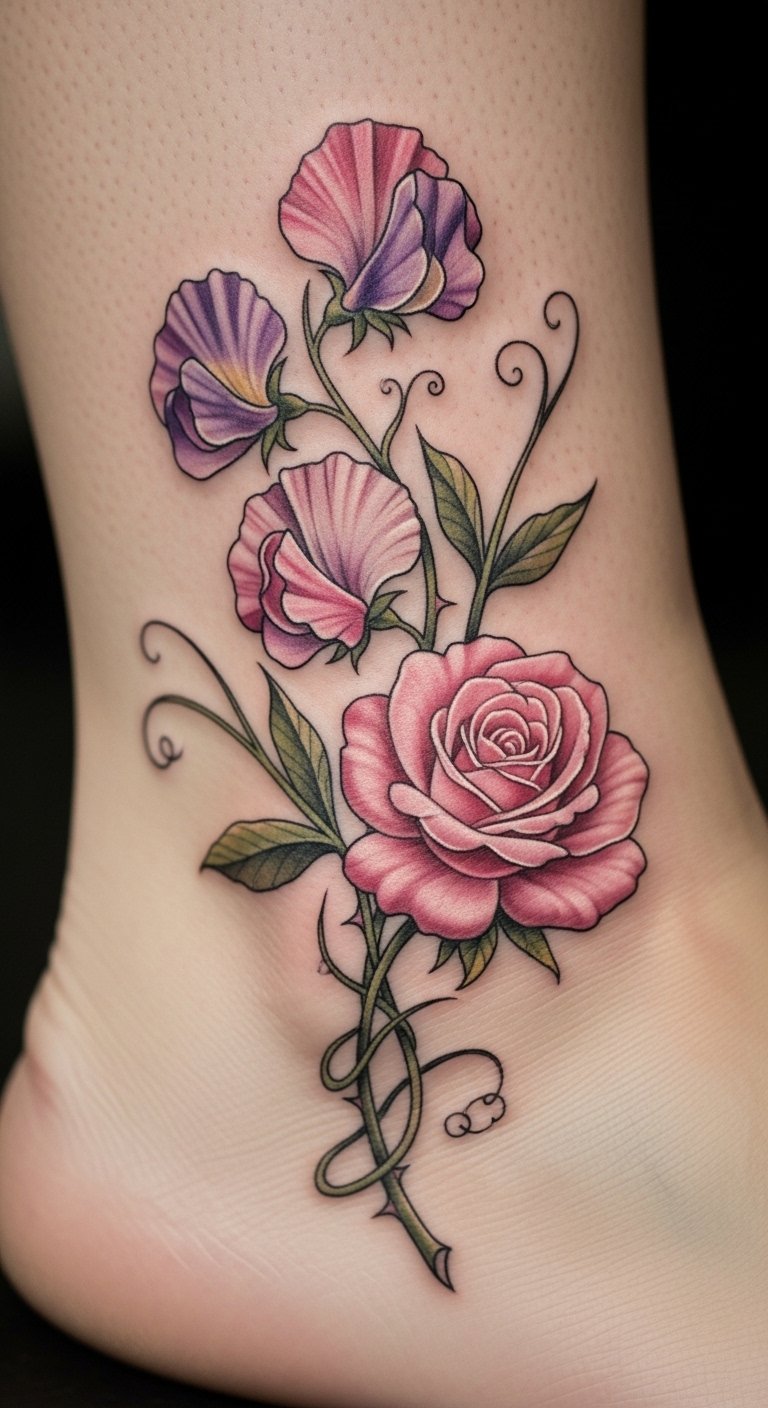 Mix sweet pea with other flowers for more depth. Start with a basic combo. Draw it on a notebook. Free resources online help. Place it on your ankle for balance. It layers personal stories. Practice blending designs at home. Use colored pencils. Keep expenses down. Look for package deals at shops. Add elements like buds. These tattoos show complex growth. Choose what speaks to you.