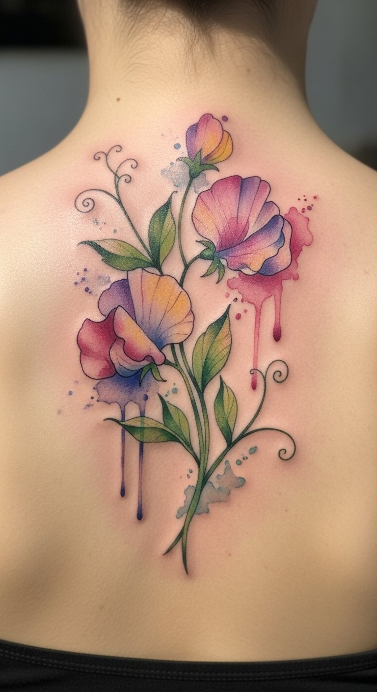 Watercolor sweet pea tattoos express creativity. Pick soft blends. Sketch with watercolors first. Free kits at home work. Place it on your back for art. It reflects fluid growth. Try painting samples. Do it yourself easily. Budget options abound. Search for student rates. Add personal shades. These tattoos capture expression.