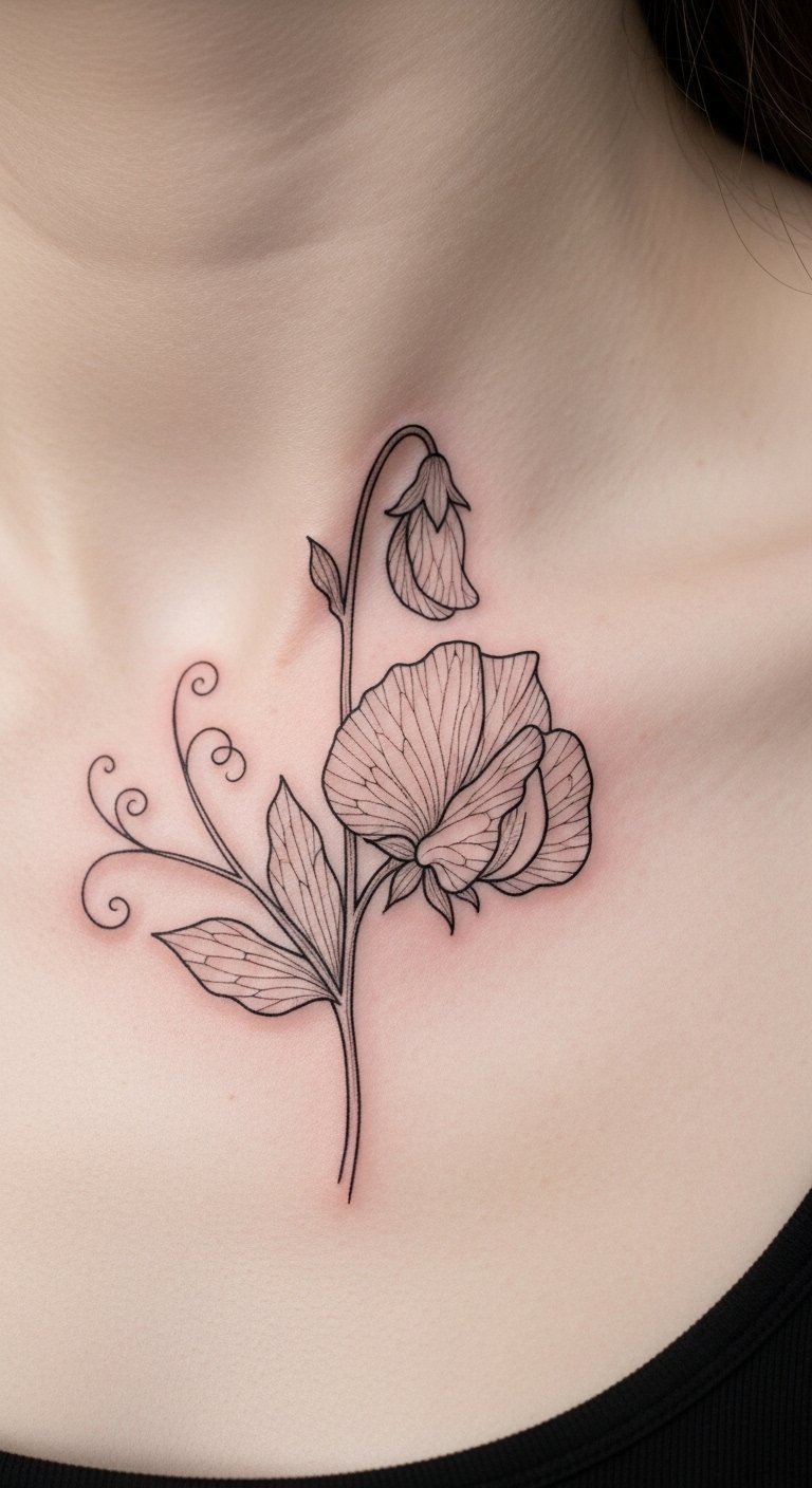 Linework sweet pea tattoos keep it elegant. Go for clean lines. Sketch simply. Free tools online. Place on collarbone for grace. It hints at growth. Try drawing lines at home. Save money. Look for quick sessions. Add a flow. These tattoos inspire simplicity.