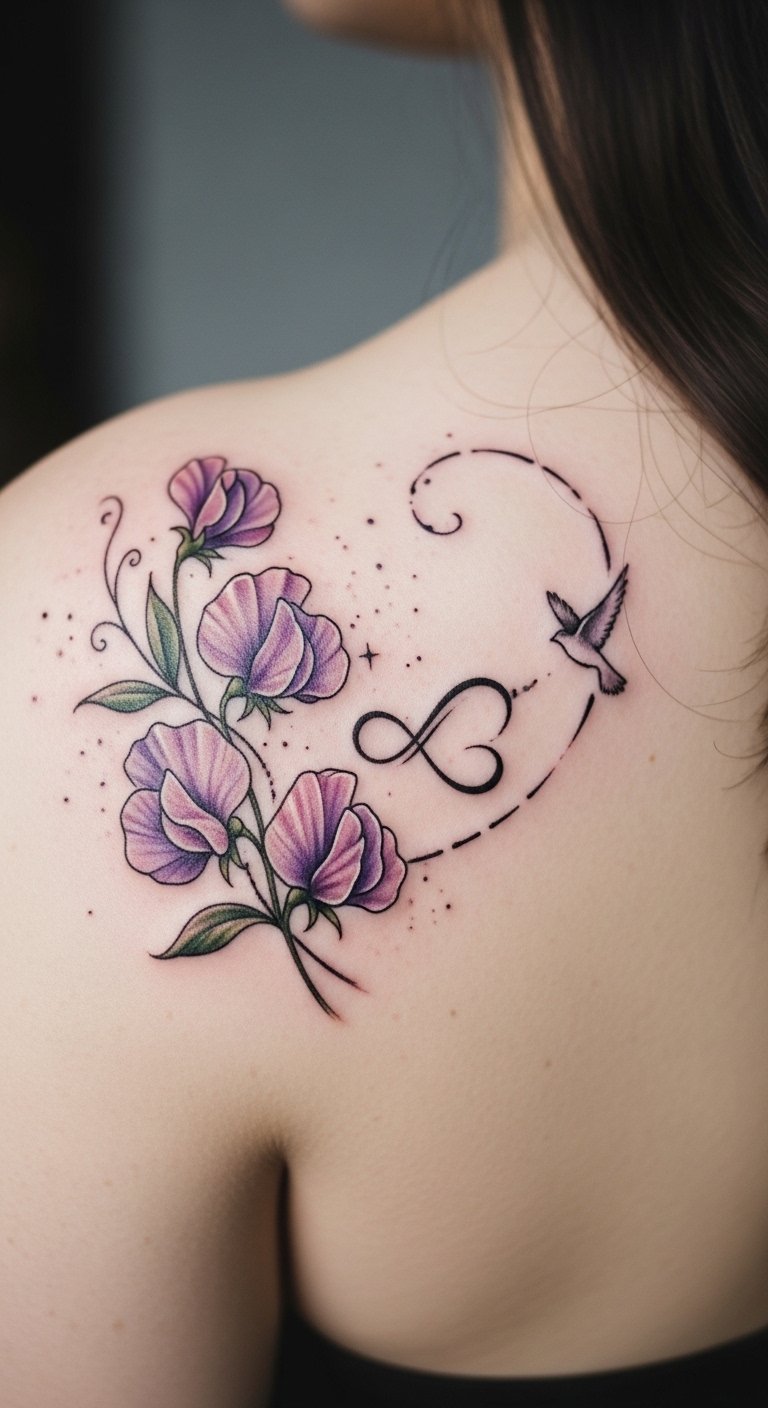 Memorial sweet pea tattoos honor connections. Choose meaningful additions. Draw memories first. Free apps guide. Place on shoulder for remembrance. It fosters growth through loss. Try collage ideas at home. Affordable paths open. Look for memorial sales. Add a name subtly. These tattoos heal.
