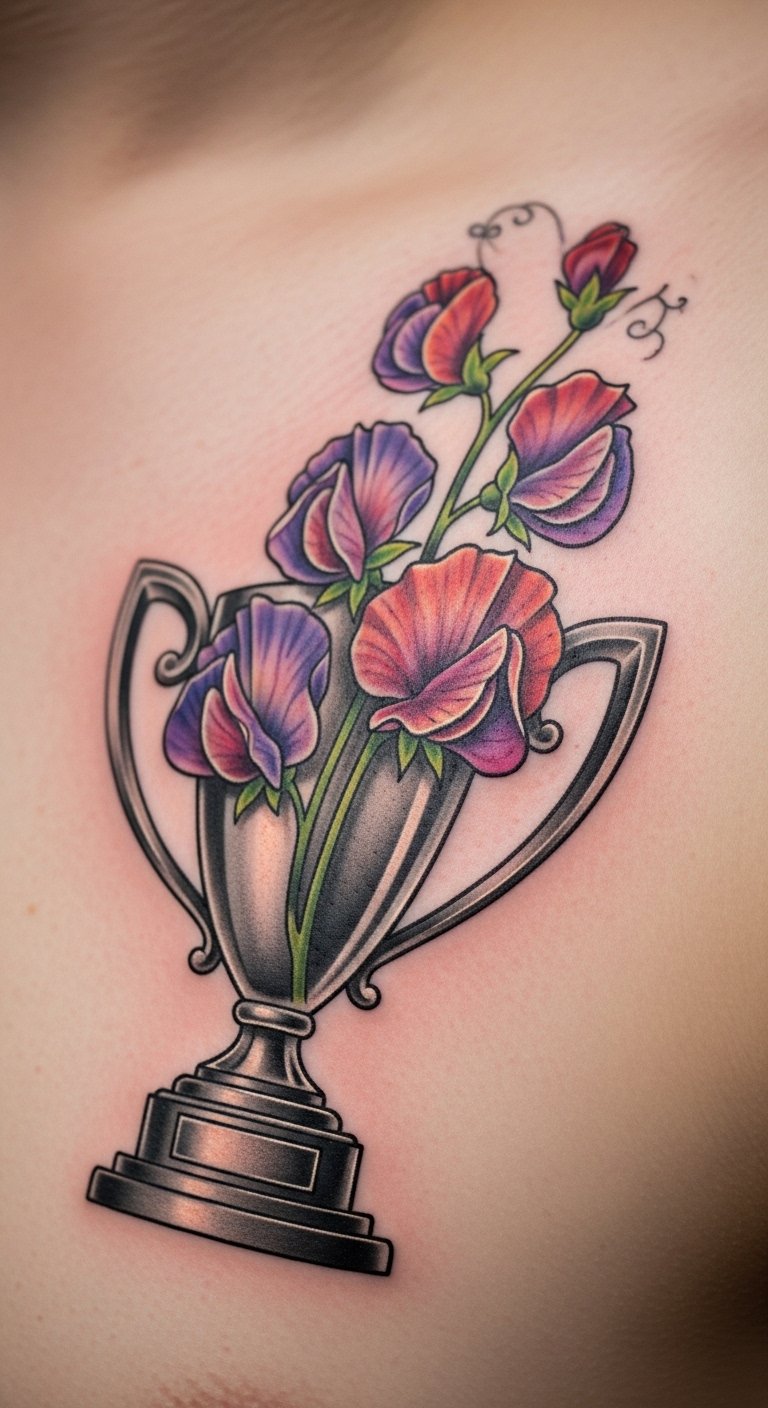 Achievement sweet pea tattoos mark wins. Choose success motifs. Draw goals met. Free achievement trackers. Place on chest for heart-felt. It celebrates efforts. Track progress at home. Budget markers. Search for win sales. Add a medal. These tattoos honor gains.