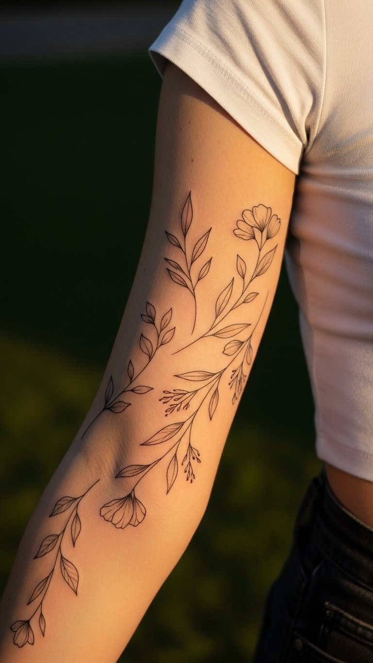 Think simple lines that say a lot. A minimalist fine-line floral sleeve uses thin strokes for flowers like roses or daisies. This design keeps things light and elegant. Start with one flower on your wrist. Add more over time. Budget tip: Visit a local artist during off-peak hours for lower rates, around $50–$100 per session. For a DIY feel, sketch your own floral ideas on paper first. Use free apps to draw and tweak designs before committing. This approach helps avoid regrets. Keep sessions short to manage pain and cost. Heal fast by keeping the area clean with basic lotion. Pair this with everyday outfits for subtle flair.