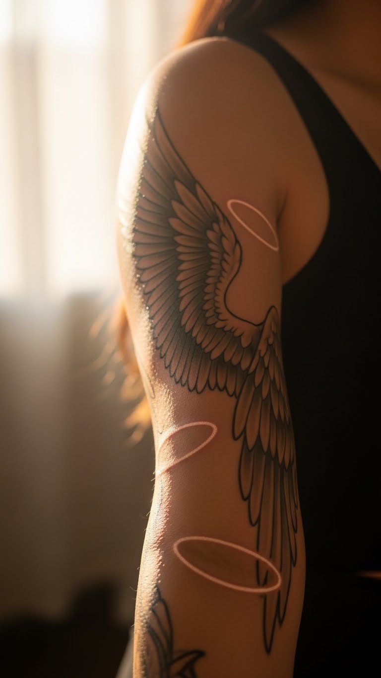 Angels provide protection and peace. A guardian angel sleeve layers wings from shoulder to elbow. Begin with a small angel on your upper arm. Add details over time. Budget tip: Find flash sales online for prices around $80. Use temporary tattoos at home to preview the design. This is a budget-friendly test. Keep appointments short. Apply simple ointments for healing. Style with casual wear for daily comfort.