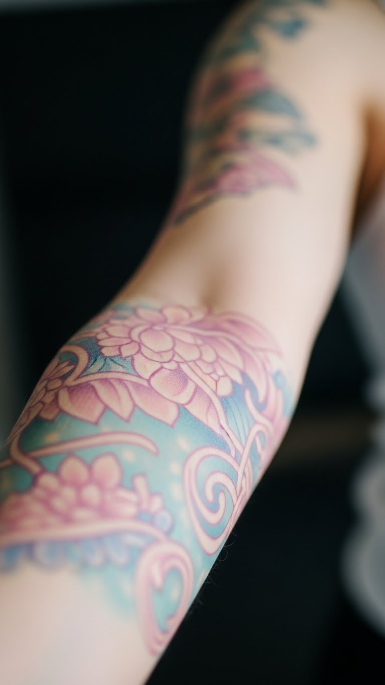 Soft colors add a gentle touch. A pastel palette sleeve uses pinks and blues for flowers. Begin with one color element. Add more. Budget tip: Find seasonal promotions for savings, about $80. Paint pastels on paper for a DIY view. This helps plan cheaply. Opt for quick visits. Heal with basic products. Wear pastel outfits to match.