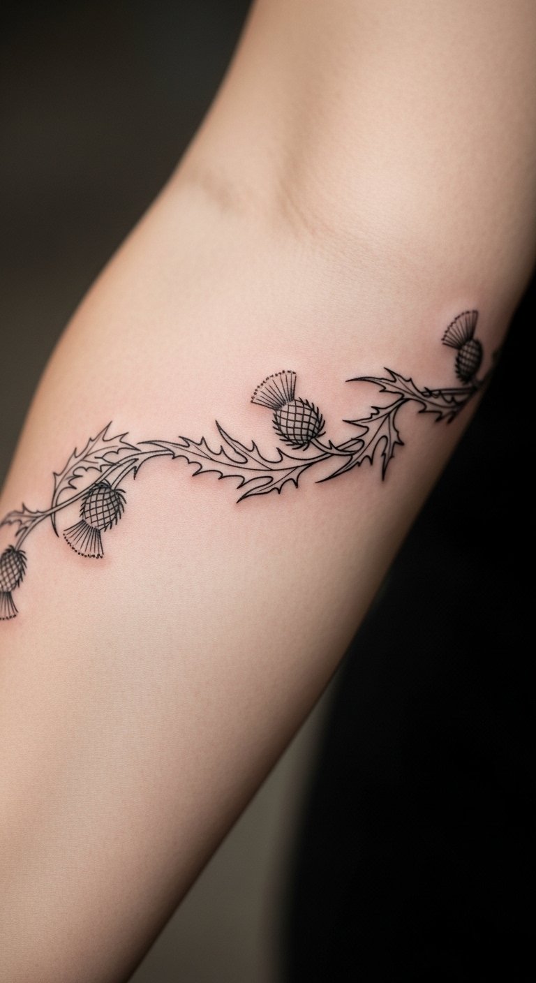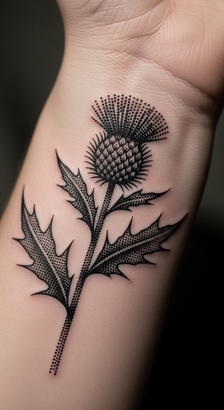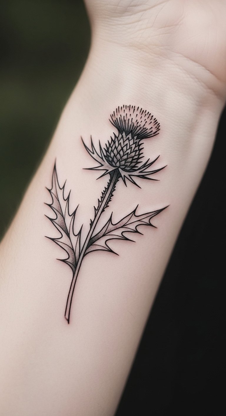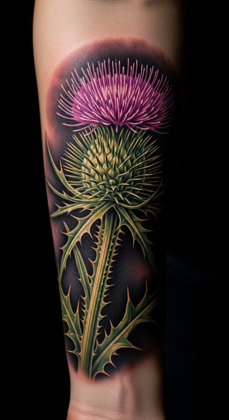 Go realistic with a thistle on your forearm to capture nature’s essence. Focus on textures like real petals. Look for experienced artists at fair rates. Practice shading at home. Keep it true to life. Heal naturally. Bold this: practice shading. The design feels alive.