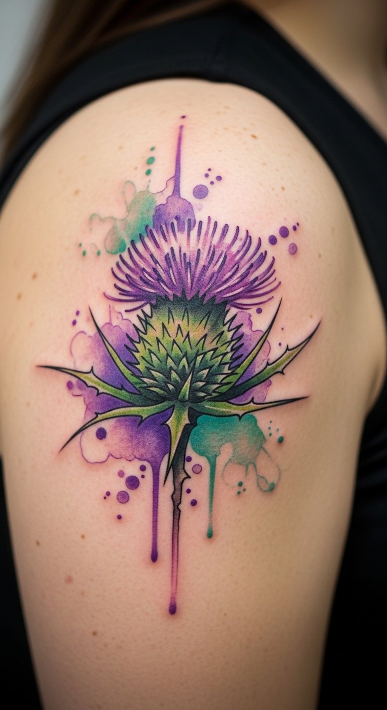 Go for a vibrant watercolor thistle to add color and flow to your skin. Place it on your shoulder for a personal touch that peeks out of sleeves. Use shades of purple and green to mimic the plant’s natural look, blending them for that painted effect. This style stands out at events, symbolizing growth amid challenges. Cut expenses by choosing a smaller design, maybe 3 inches, and ask your tattoo shop about package deals. At home, experiment with watercolors on paper to visualize the final result—grab affordable paints from a craft store. Combine it with other elements like a small leaf for added meaning. Remember to care for it with basic lotion from your cabinet, not fancy products. Bold this tip: use home paints for practice sketches. You’ll get a tattoo that feels alive and reflects your spirit in a fun way.