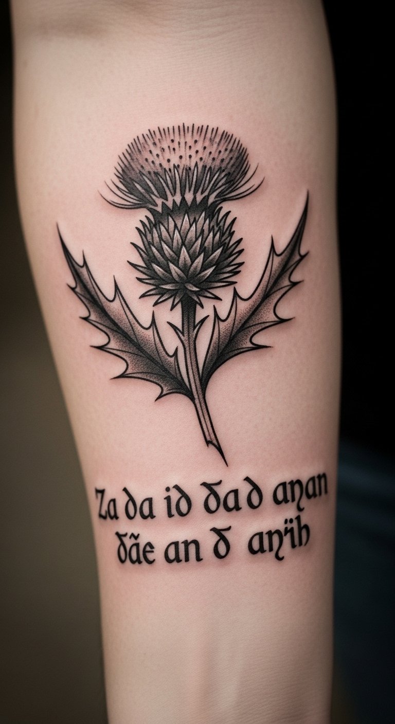 Add depth with a Scottish thistle paired with Gaelic text, like a meaningful word on your forearm. Focus on the thistle’s spines to represent protection, and keep the text simple for clear reading. This combo honors heritage without overwhelming the design. Opt for a local artist who knows cultural symbols to ensure accuracy—check their portfolio online first. Save cash by designing it yourself: use free font apps to pick styles and draw on paper. Wear it as a daily reminder of your roots. For maintenance, stick to gentle soaps you already have. Bold the advice: check portfolios before booking. This tattoo turns your arm into a story of strength and tradition.