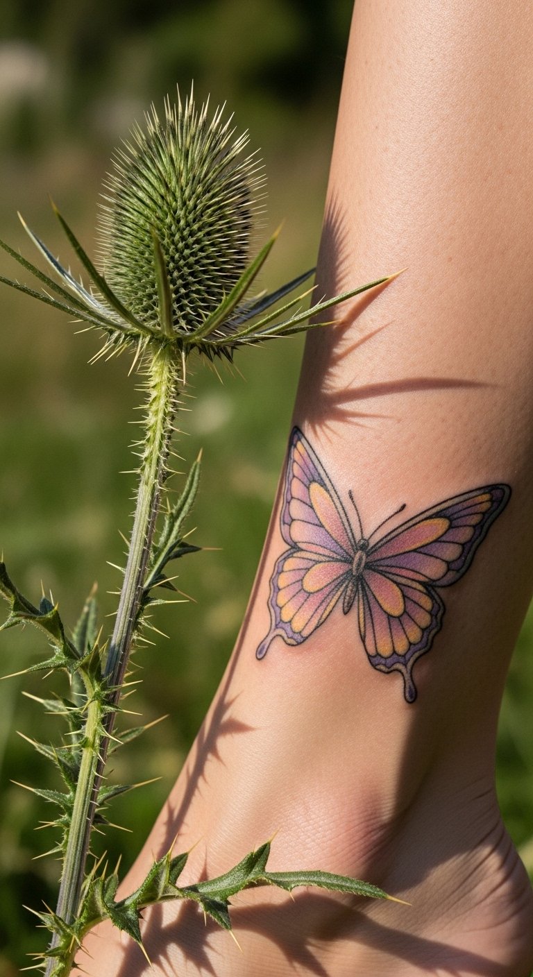 Create a feminine thistle with a butterfly on your ankle for a graceful vibe. Place the butterfly on the thistle to symbolize transformation and strength. Use light colors to keep it delicate yet bold. Search for artists who specialize in this style online and request samples. Practice at home by sketching butterflies with pencils from your desk, making it easy to refine. Keep the design compact to reduce session time and costs. Care for it with items in your medicine cabinet, like aloe. Bold the tip: request samples to see their work. This tattoo celebrates your journey in a beautiful way.