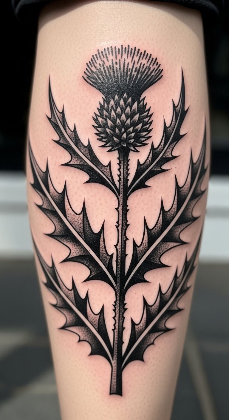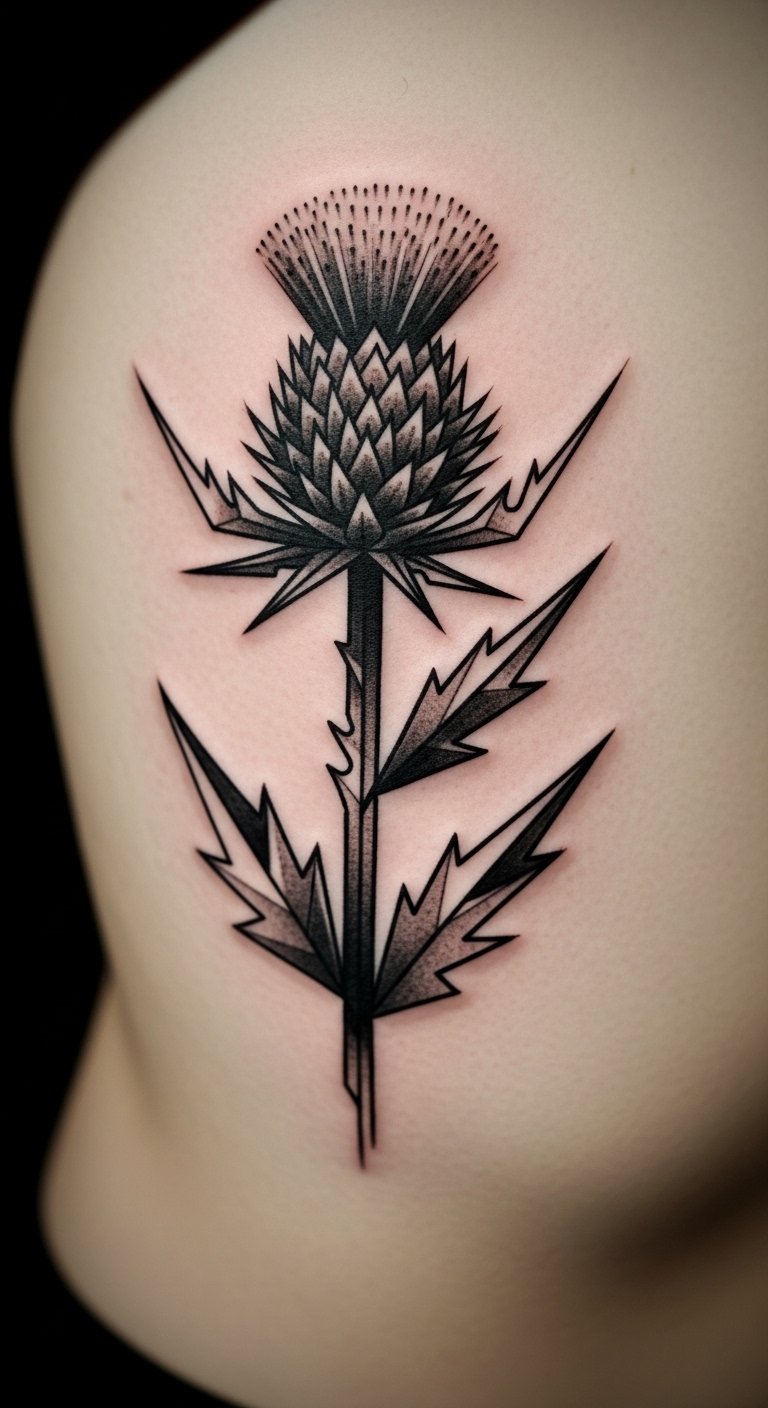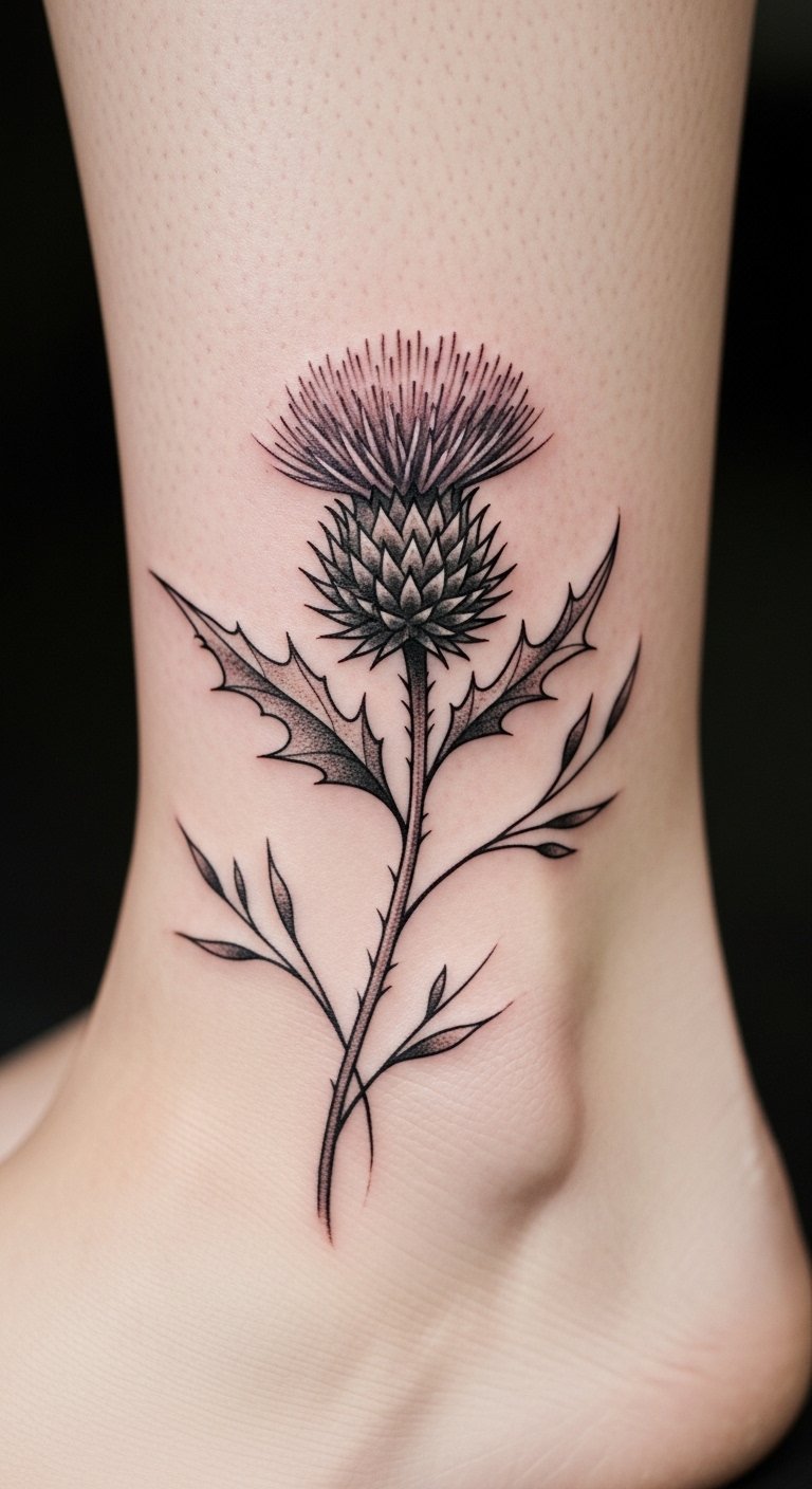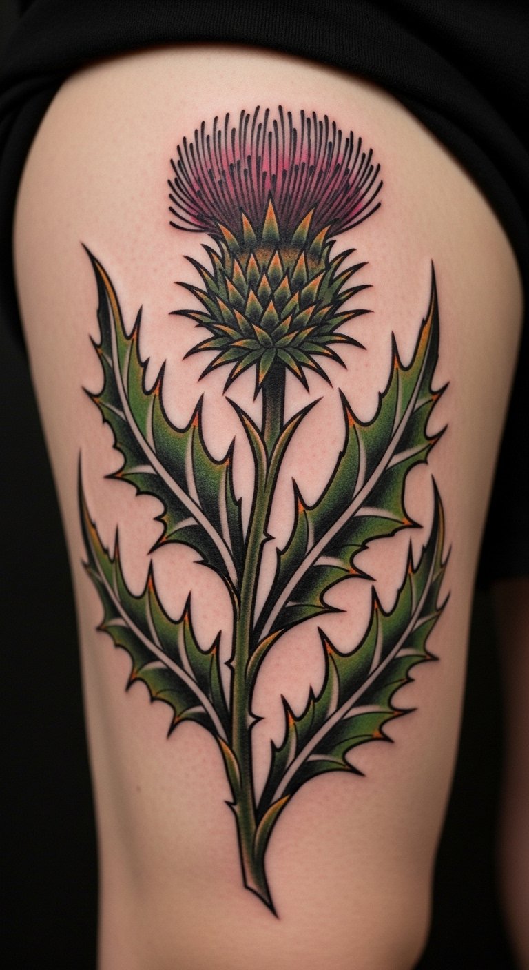 Opt for a neo-traditional thistle on your thigh for a timeless feel. Incorporate bold lines and subtle shading to make the spines pop. This style mixes old and new, perfect for showing endurance. Look for deals at tattoo conventions or local events to save money. Draw inspiration at home using old magazines for patterns—trace them onto paper. Add elements like a stem for extra meaning. Use household bandages for aftercare. Bold this: look for deals at events. Your tattoo will stand as a mark of your story.