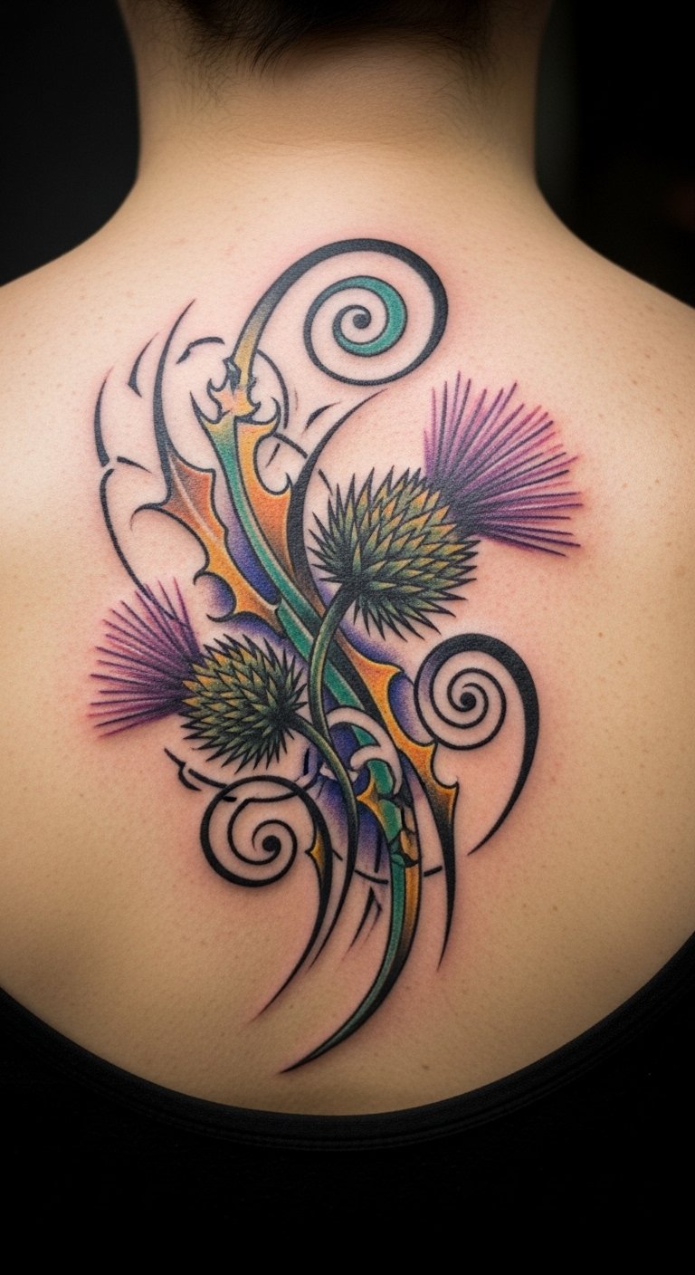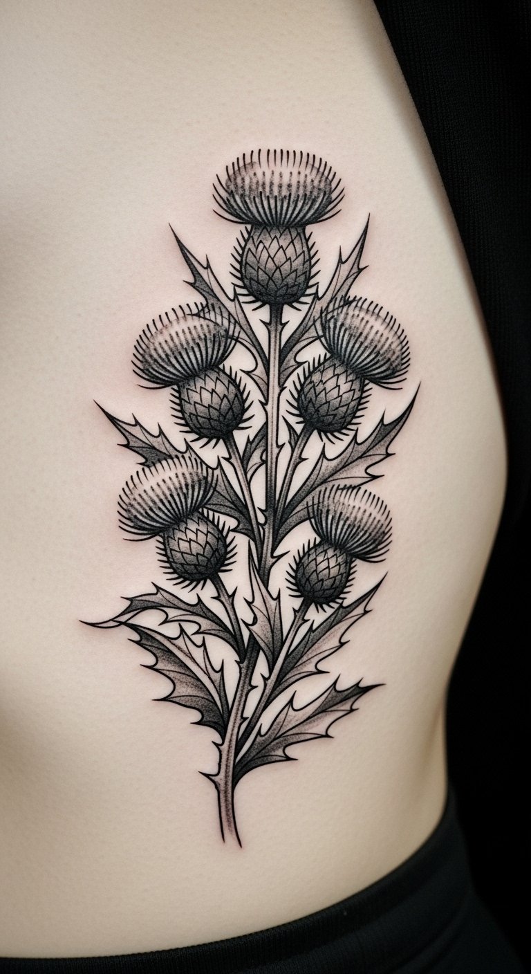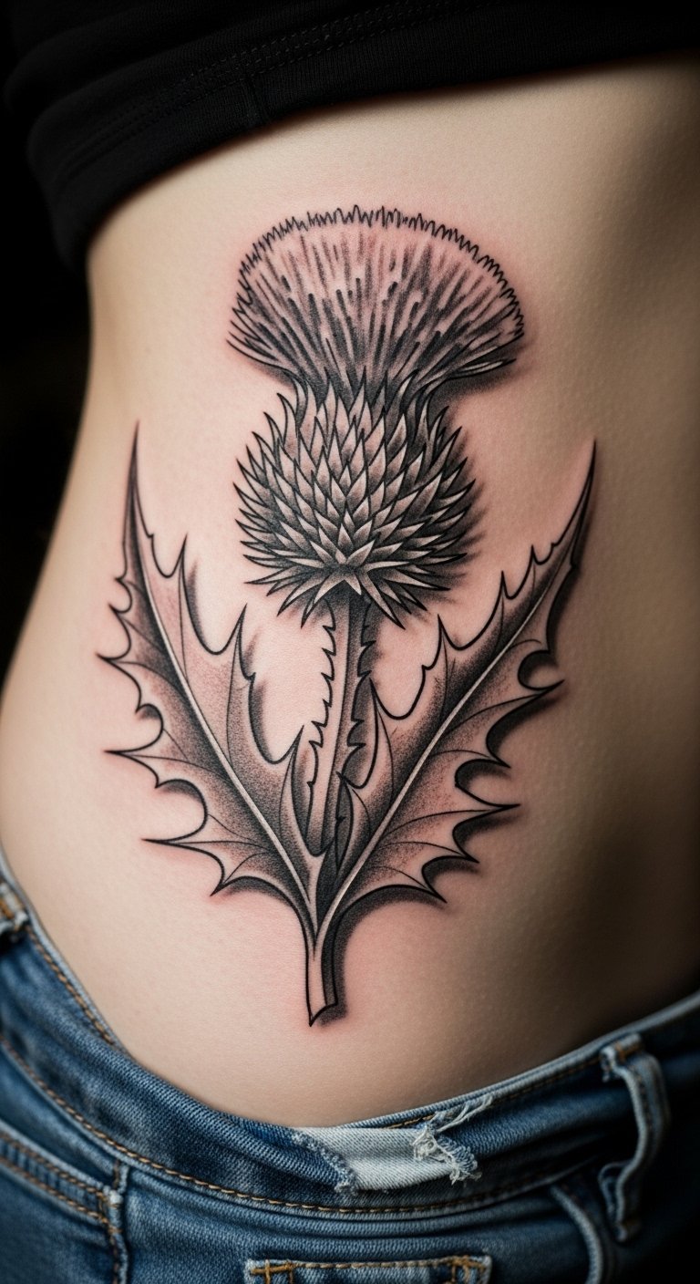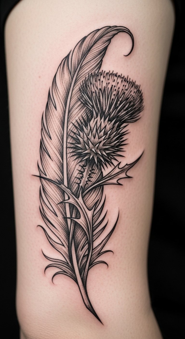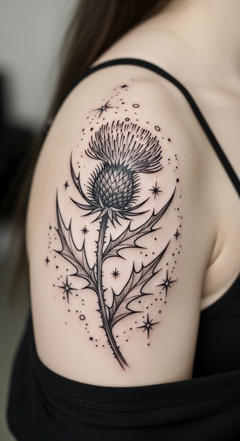 Opt for a neo-traditional thistle on your thigh for a timeless feel. Incorporate bold lines and subtle shading to make the spines pop. This style mixes old and new, perfect for showing endurance. Look for deals at tattoo conventions or local events to save money. Draw inspiration at home using old magazines for patterns—trace them onto paper. Add elements like a stem for extra meaning. Use household bandages for aftercare. Bold this: look for deals at events. Your tattoo will stand as a mark of your story.