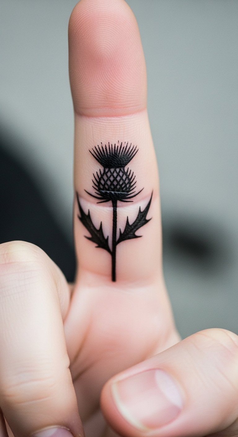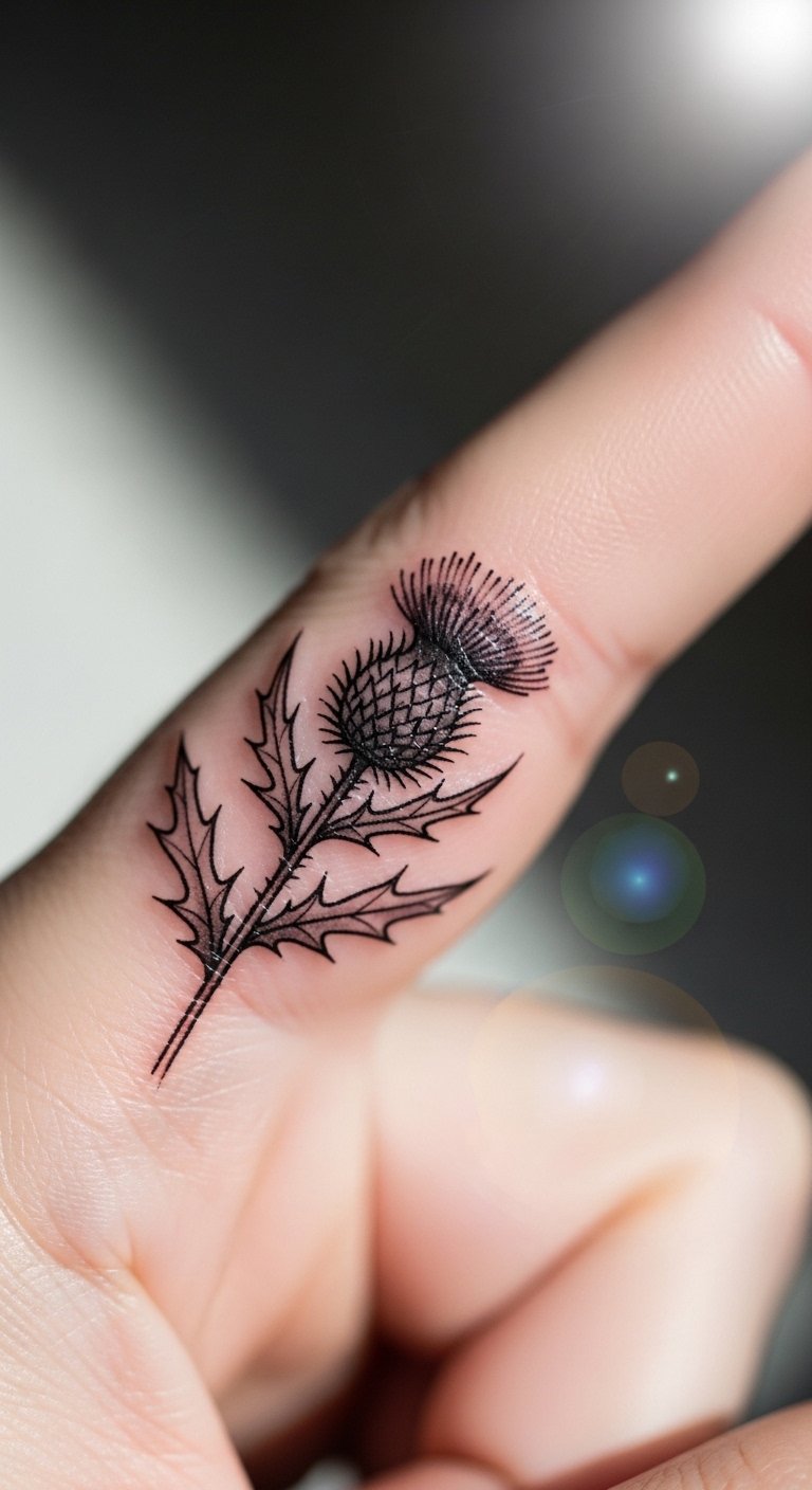 A small thistle on your finger offers a discreet option. Keep the design simple with just the bloom and a few spines. It’s ideal for daily wear under rings or gloves. Find budget artists by checking social media reviews. Sketch it on your hand with a marker first to test the look. This size means shorter sessions and lower prices. Heal it with basic creams you have. Bold the advice: test with a marker before going pro. It’s a subtle way to carry your strength.