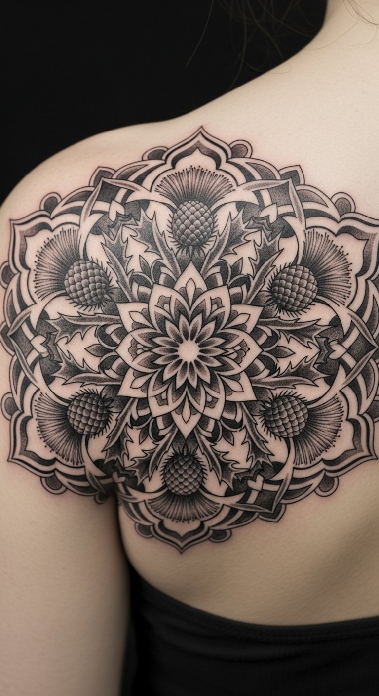 Blend a thistle with a mandala on your shoulder blade for spiritual depth. Arrange the patterns symmetrically around the flower for balance. This design merges culture and calm. Compare artist prices online to find affordable options. Practice drawing mandalas at home with a compass from your toolkit. Customize it with colors from your palette. Protect it with everyday lotions. Bold this: compare prices online. The result is a meaningful piece for your path.
