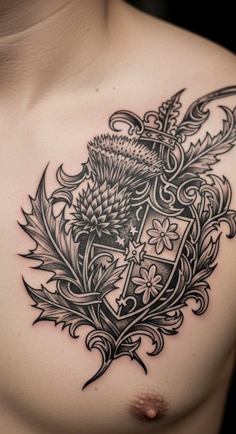 Incorporate a thistle with your family crest on your chest for heritage pride. Position the crest beside the thistle for a personal narrative. Research symbols online to get it right. Barter for prices with artists if possible. Sketch the crest at home on paper. Keep it modest for affordability. Use common ointments for healing. Bold this: research symbols online. It’s a tribute to your roots.