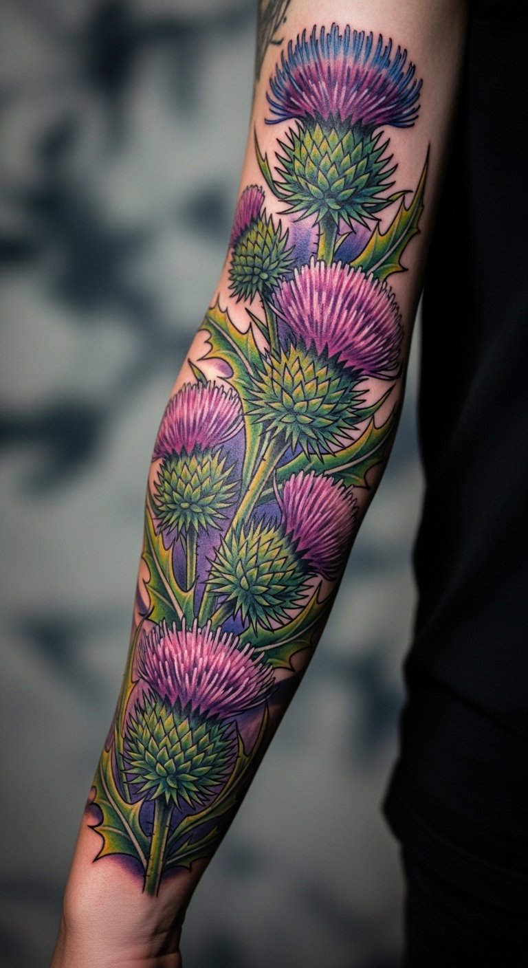 Build a colorful thistle sleeve on your arm for a full story. Layer different thistles in bright colors for variety. Break it into sessions to manage costs. Plan at home with colored pencils. Add elements over time. Care with daily products. Bold this: break into sessions. The sleeve becomes your canvas.