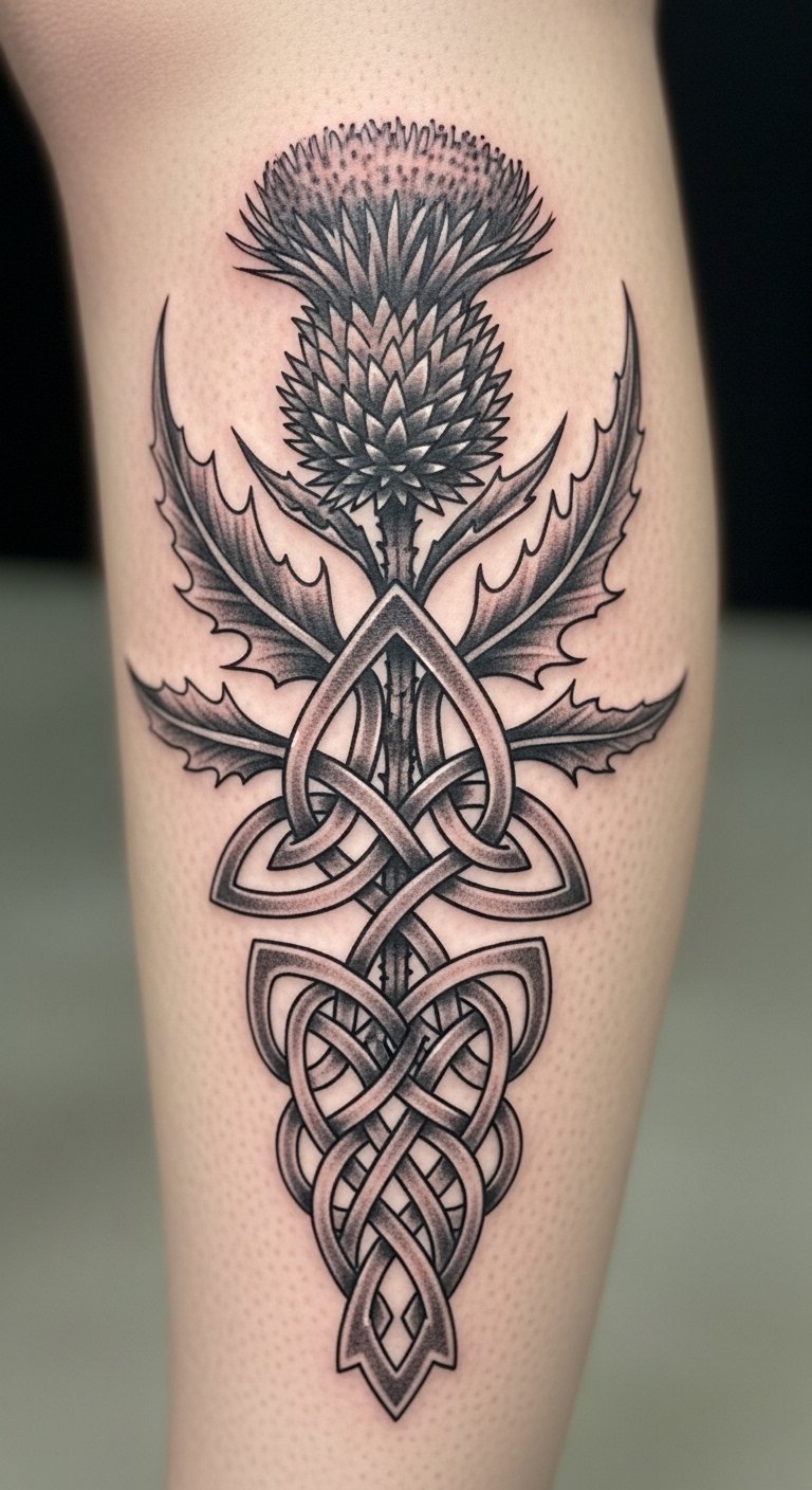 Incorporate Celtic knots with a thistle on your leg for cultural ties. Weave them around the design. Seek local experts. Sketch knots at home. Personalize it. Use basic aftercare. Bold the tip: seek local experts. It’s a nod to history.