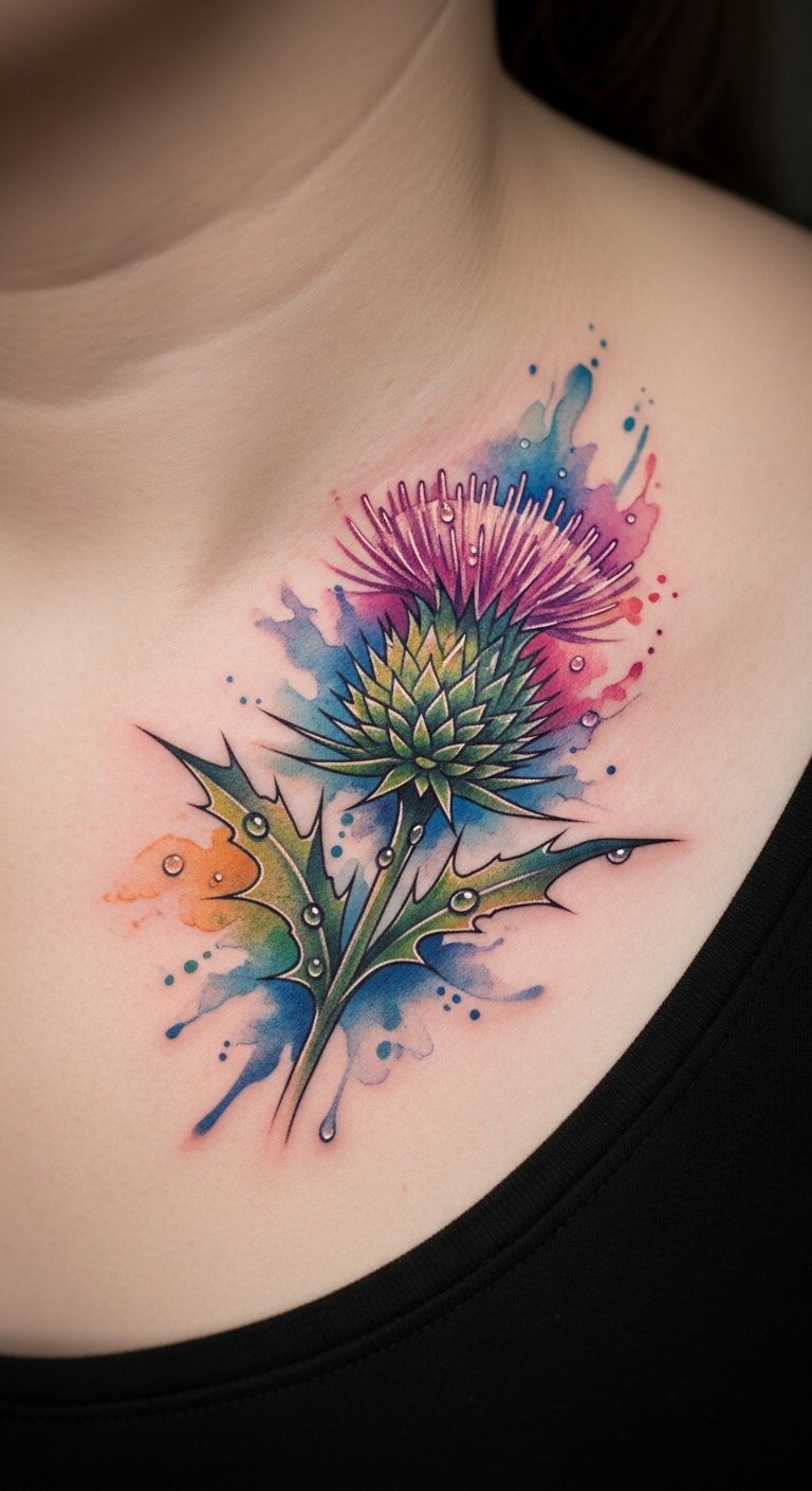 Add dew drops to a watercolor thistle on your collarbone for freshness. Blend colors smoothly. Find budget options. Draw drops at home. Keep it fresh. Heal with ease. Bold this: find budget options. The design sparkles.