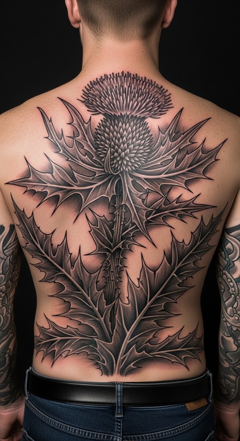Go large with a thistle on your back for impact. Fill the space thoughtfully. Split into sessions. Plan at home. Make it epic. Use care products. Bold the tip: split sessions. The piece covers you in power.