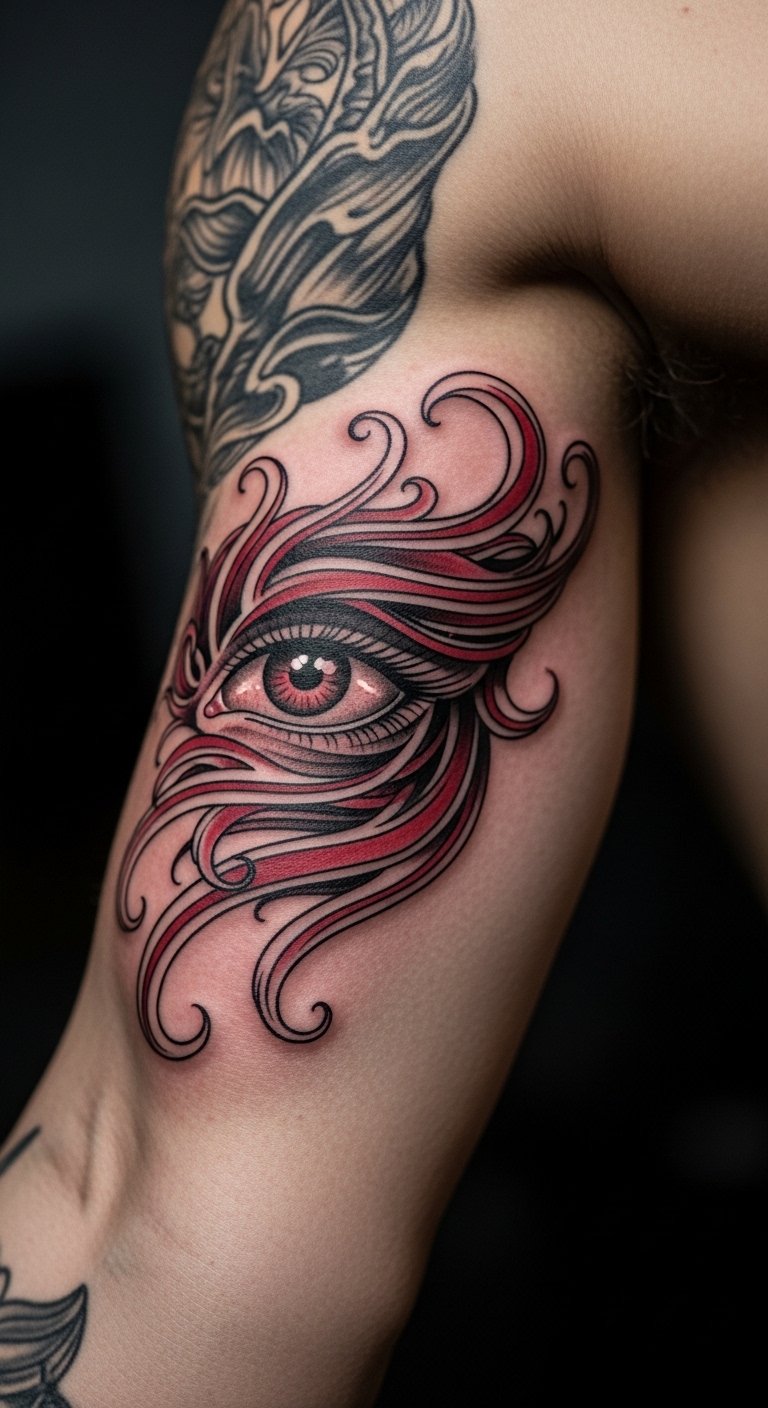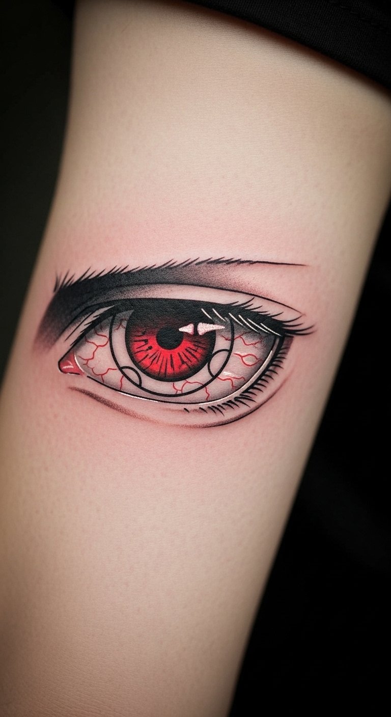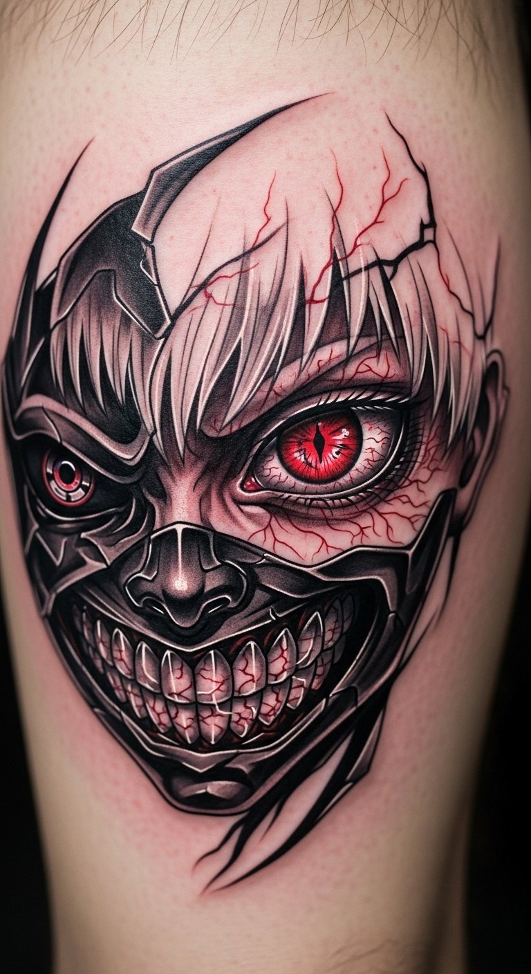 Think about Kaneki’s eye as your go-to symbol for inner duality. This tattoo shows a single eye with that striking red glow. Start small on your forearm for less pain and cost. Pick a local artist who nails anime details. Save money by sketching ideas at home with free apps. Go for black ink to keep it simple and affordable. Add personal twists, like combining it with a small flower. Healing takes weeks, so cover it with breathable bandages. You might spend $50 to $150 for a basic version. Try practicing on paper first to visualize it. This design fits daily life without drawing too much attention.