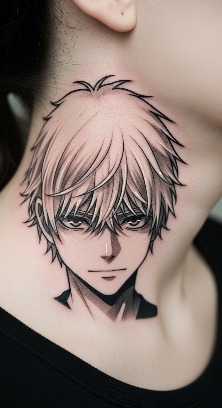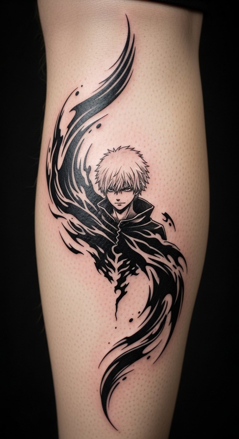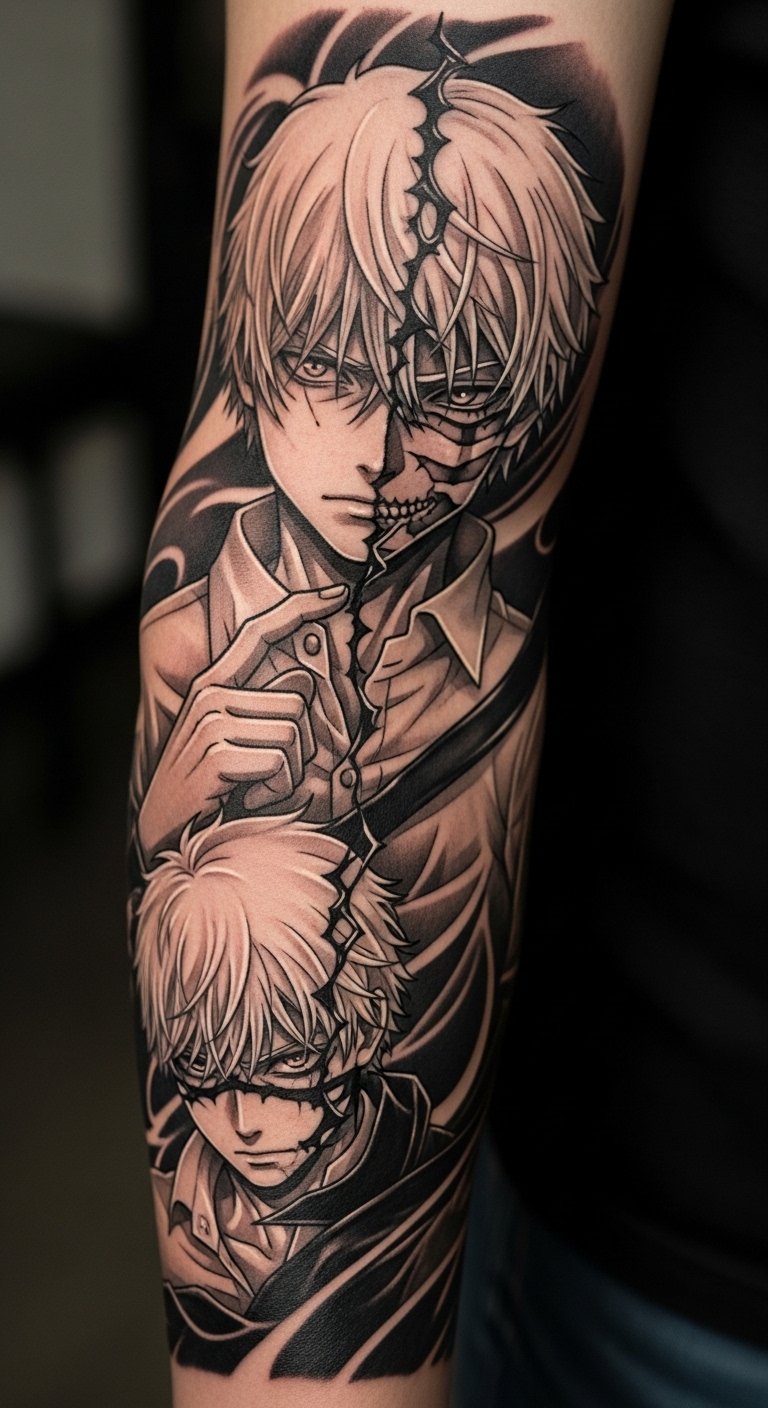 White hair tattoos nod to Kaneki’s change. Put it on your neck for subtlety. Stick to shades for budget, under $80. Draw with markers at home. Heal with everyday lotions. Pair with lines for contrast. This design fits under collars. Practice sketches to refine. It’s a simple fan tribute.
