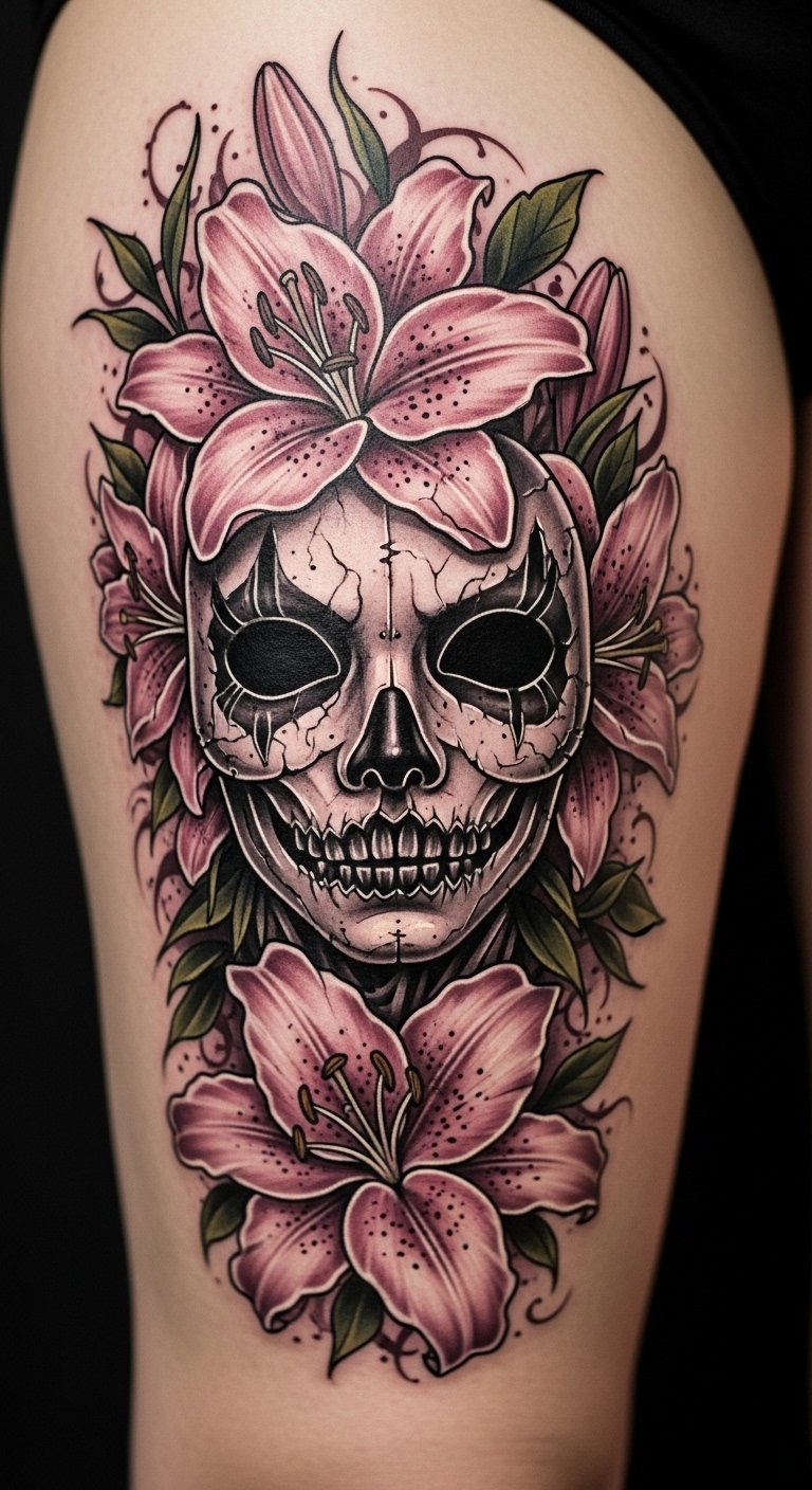 Blend masks and lilies in color for impact. Back placement adds drama. Limit hues for budget, about $130. Use templates online. Heal with natural options. Personalize with extras. Ideal for events. Sketch variations. This mix is visually striking.