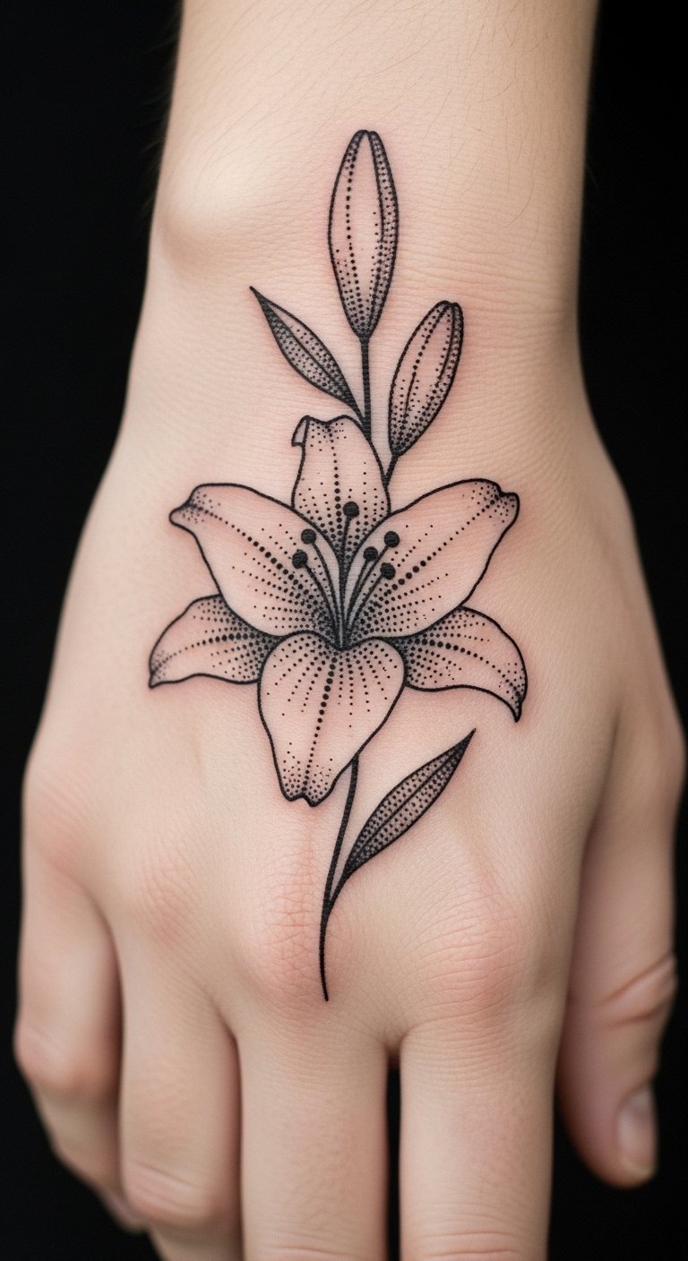 Dot work lilies are precise and modern. Hand placement for visibility. Dots cost less, under $80. Use dot tools at home. Simple healing. Mix with dots. Trendy look. Experiment simply. Affordable art.