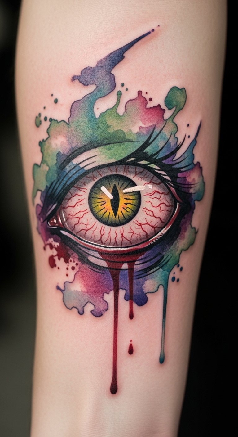 Watercolor eyes add softness. Forearm visibility. Soft styles save, around $110. Blend colors yourself. Gentle healing. Mix styles. Artistic eye. Experiment blends. Soft appeal.