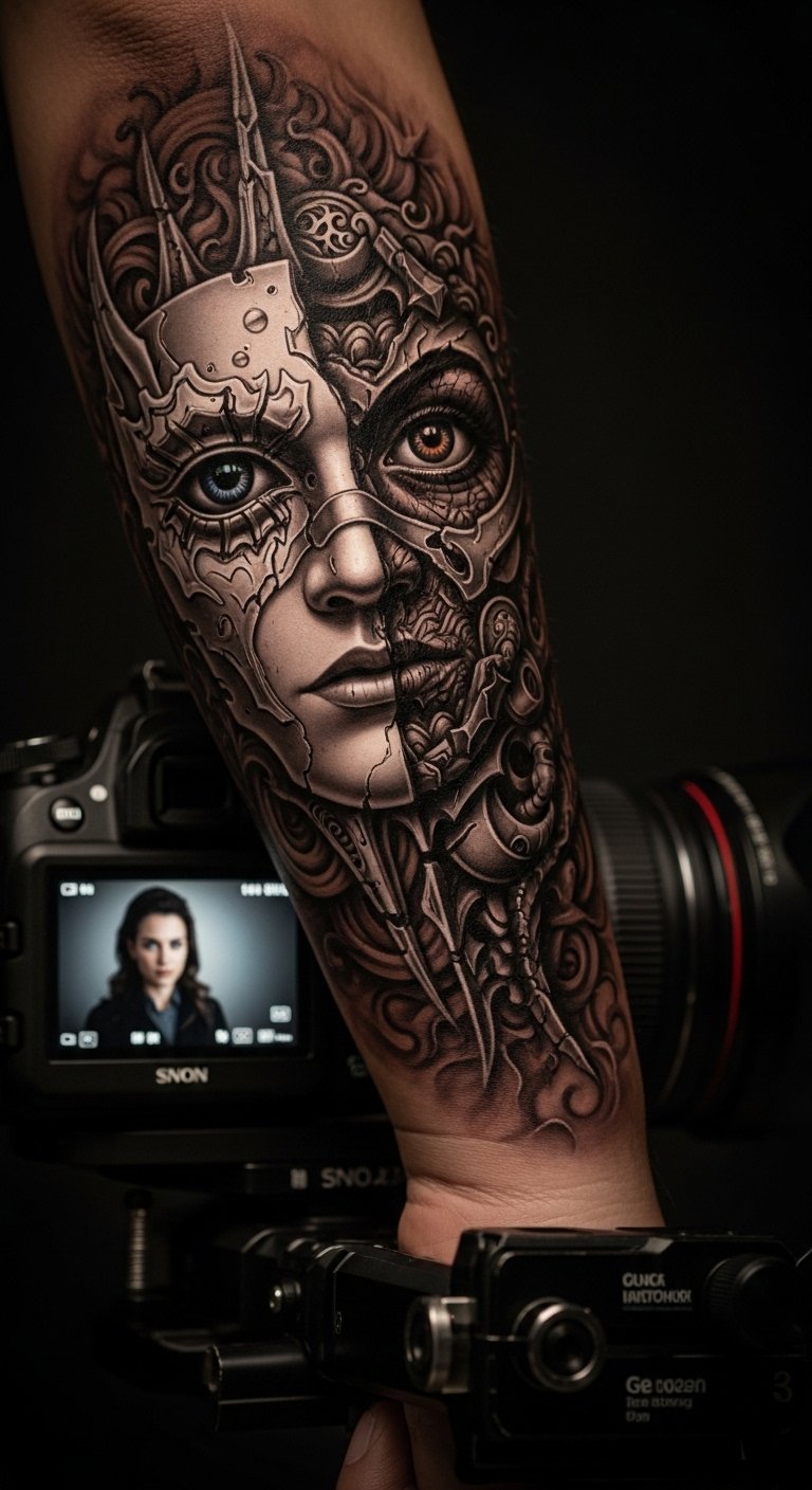 Arm sleeves show dual themes. Build gradually to manage costs. Start with one element for $200 total. Design in stages at home. Care step by step. Layer symbols over time. Great for collections. Plan with apps. Phased approach works.