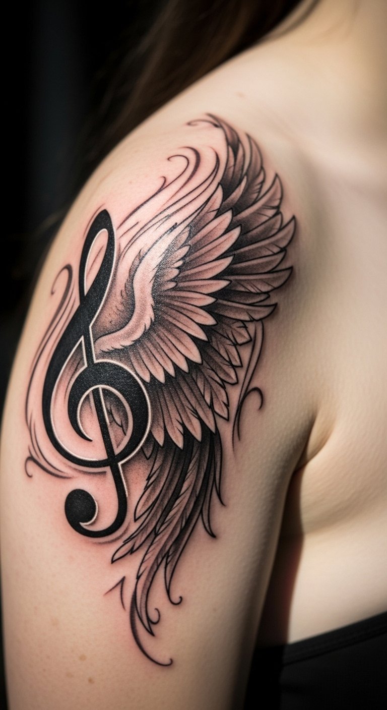 Feathers add movement without overwhelming the design. Wings symbolize adventure—pair with your favorite song lyrics in mind. Keep colors minimal to avoid fading; black ink lasts longer. This setup makes your tattoo a story of escape and rhythm.