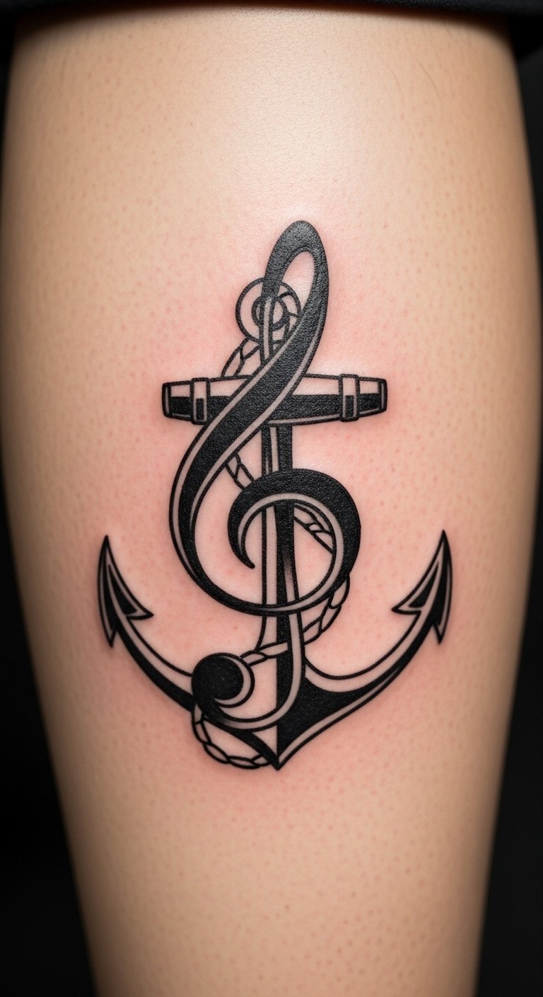 The anchor grounds the symbol nicely. Stability pairs with music—reflect on your journey. Go bold but basic to keep it affordable.