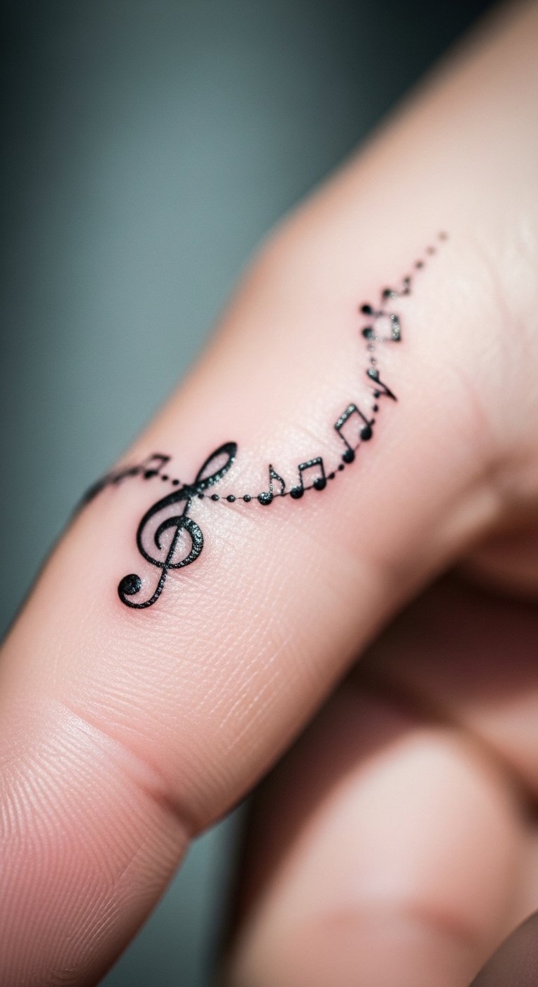 Link your treble clef to a chain of notes for a flowing story. Sketch sequences on notebook paper—easy and free. Finger tattoos can cost $30.