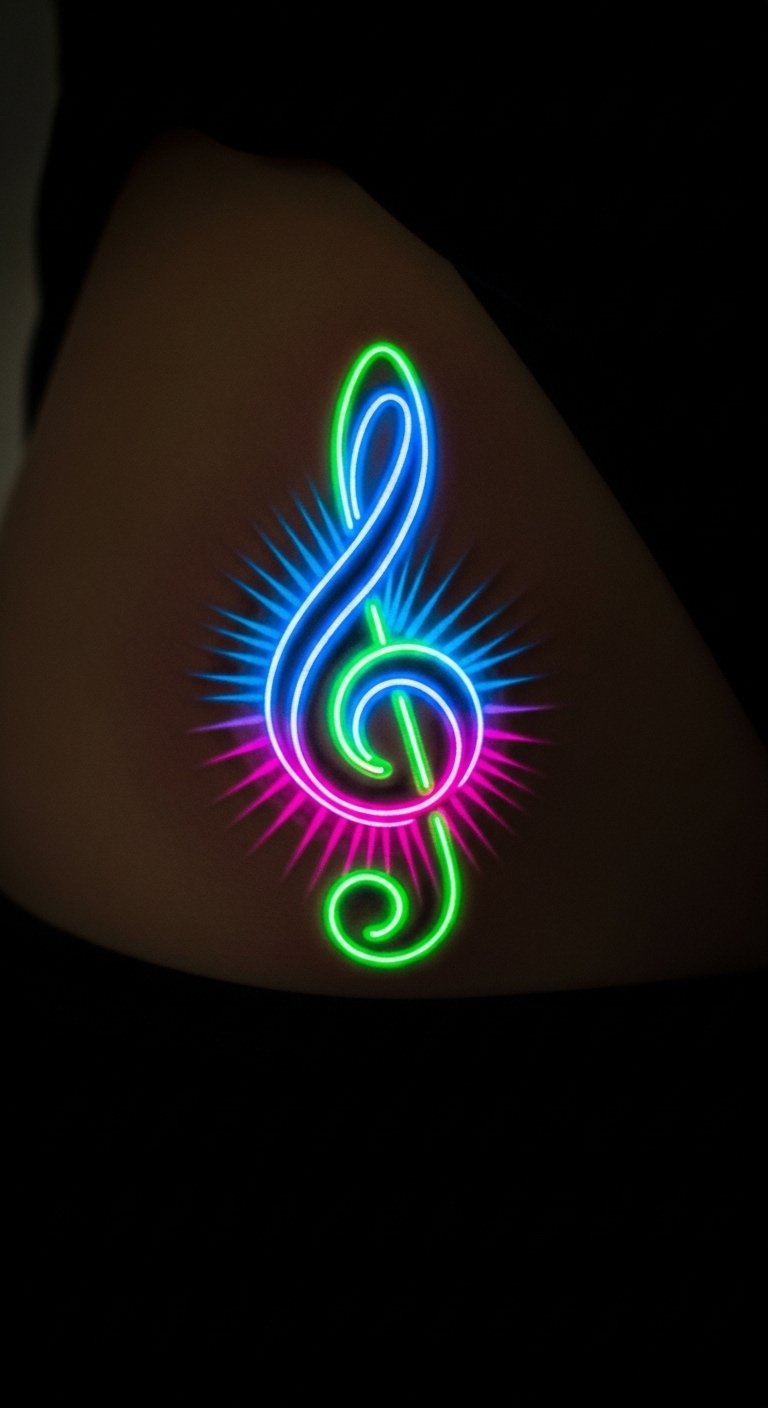 Go neon with your treble clef on the hip for a fun glow. Use glow-in-the-dark stickers to test—under $5. Artists add colors for about $150.
